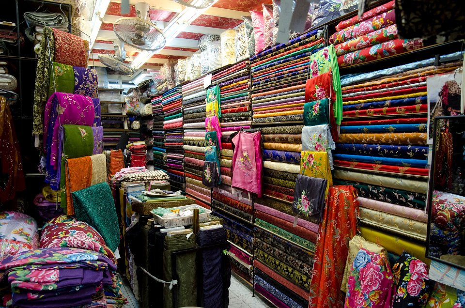 Allée de commerces de vêtements et objets en tissu