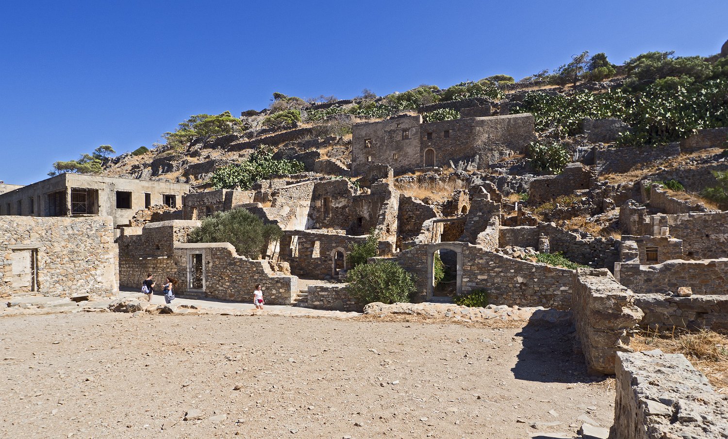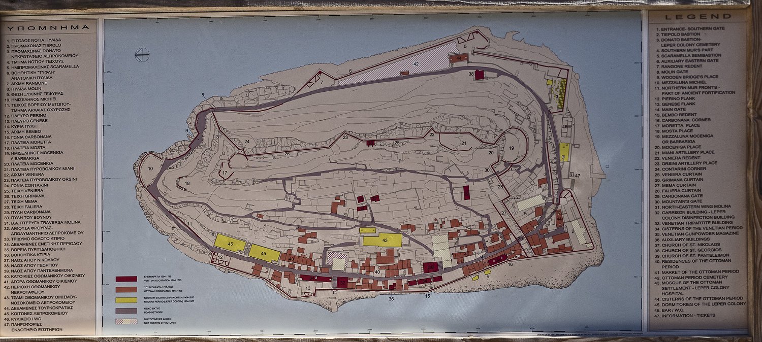 Vue de l'ile  L'ile fut autrefois une presquile. Elle était reliée à la terre par un isthme qui fut percé par les français en 1897. Panorama de l'ile Spinalonga- habitations et fortifications  L'ile était protégée par une forteresse bâtie par les vénitiens. En 1904, l'ile fut vidée de sa population qui fut remplacée par les lépreux issus des quartiers misérables de différentes villes de Crète Plan de l'ile Fortifications et entrée du site Entrée du site (Porte de Dante)