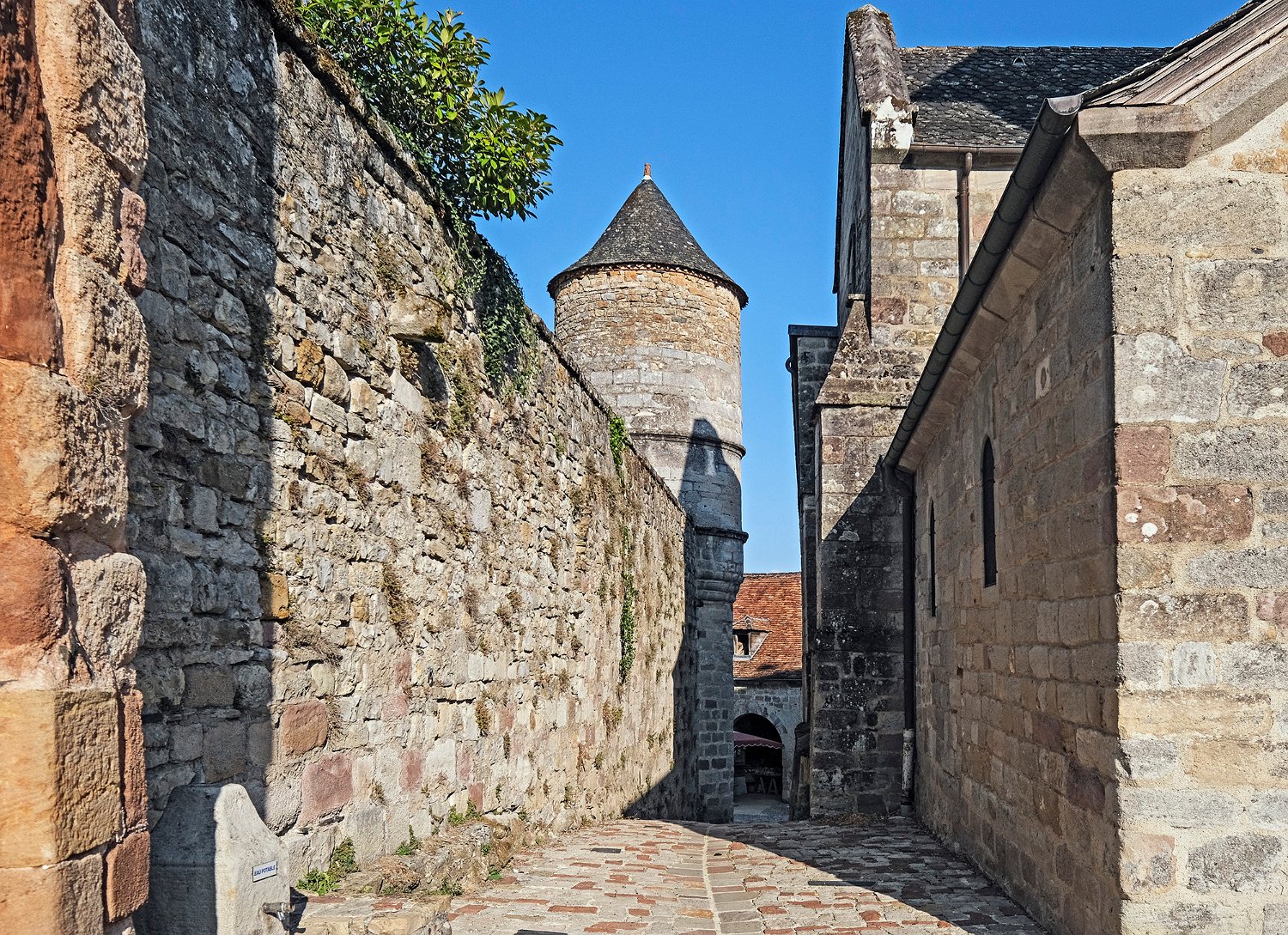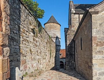 Rue bordée de maisons nobles et des remparts des châteaux (à droite)