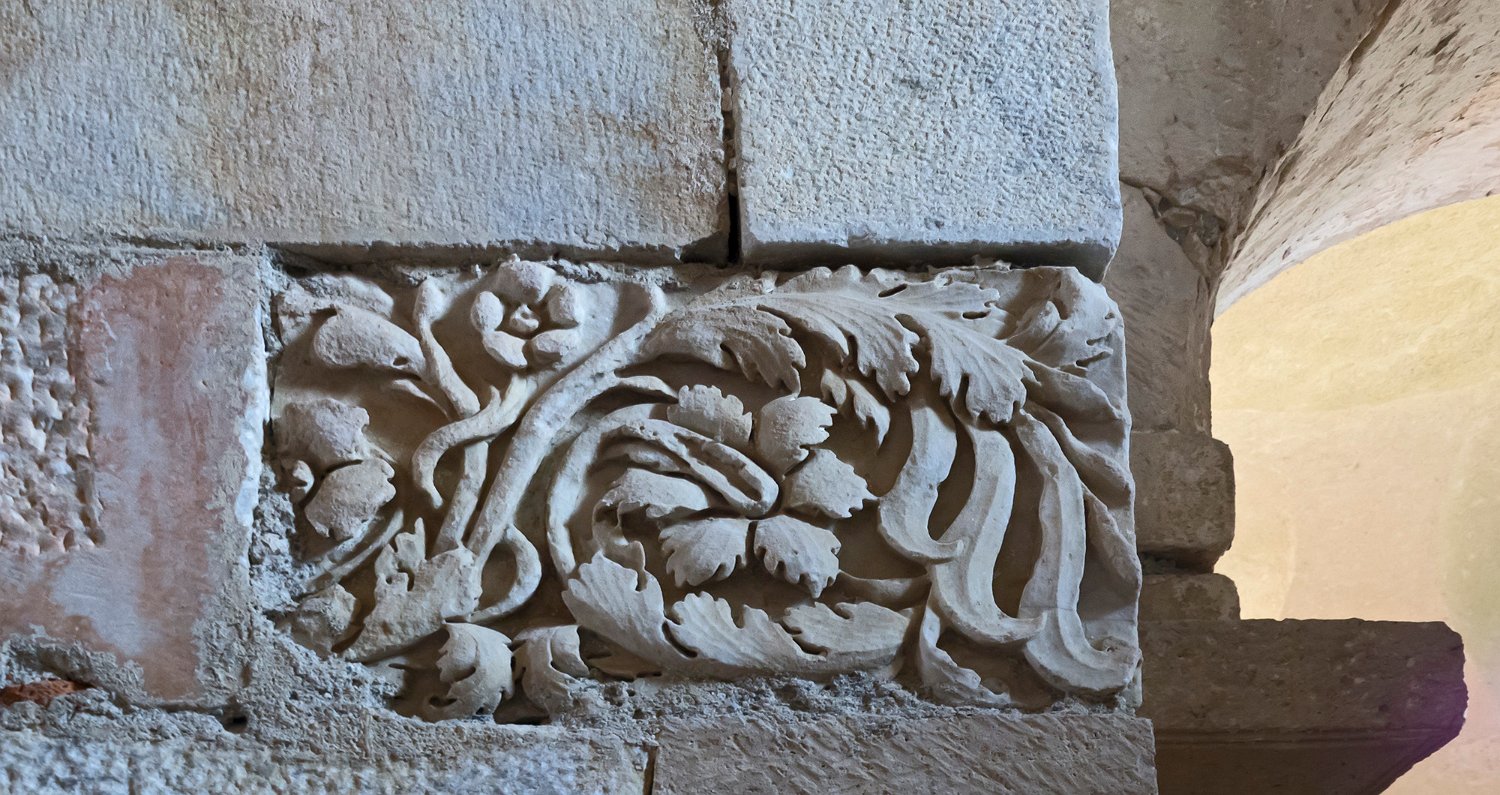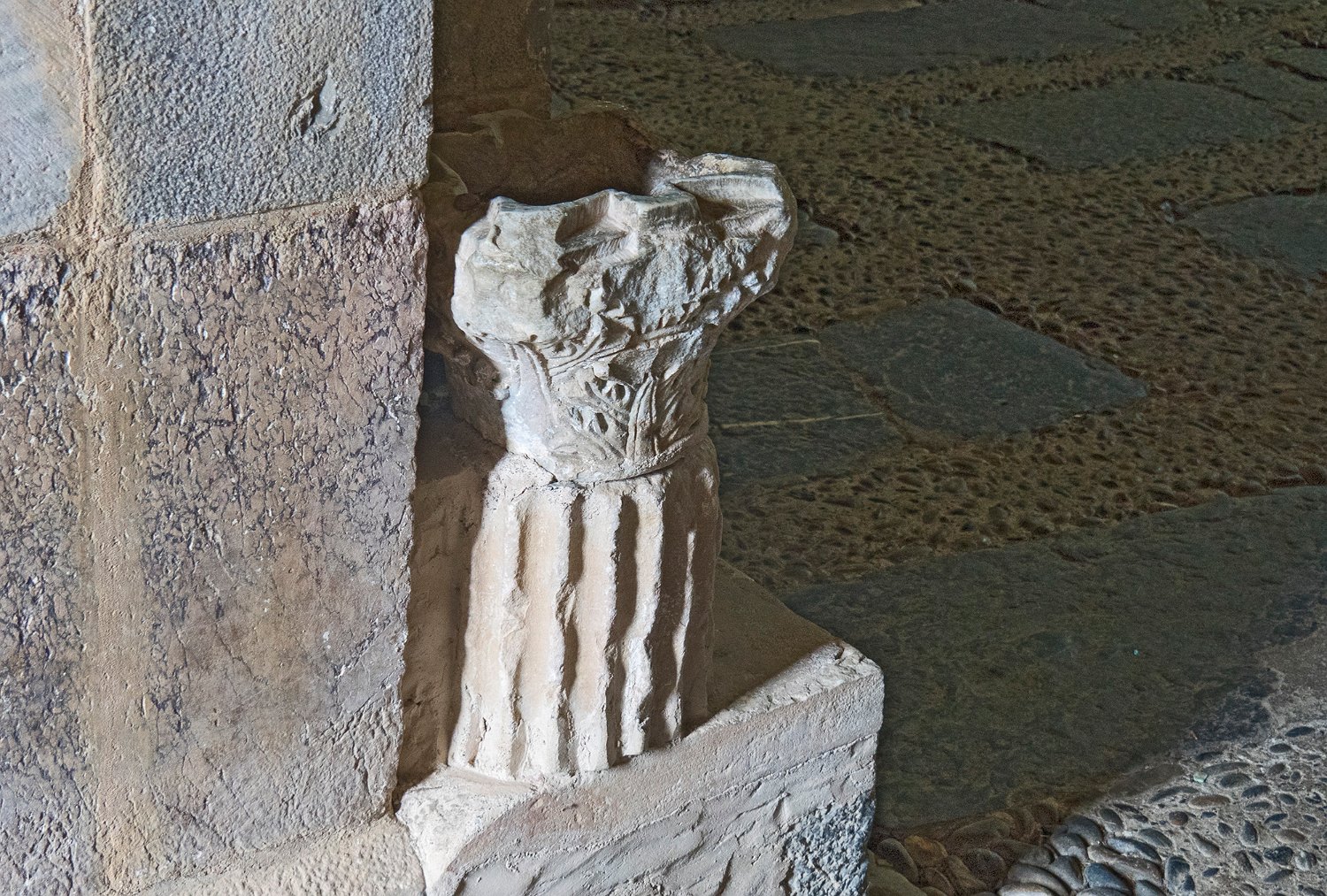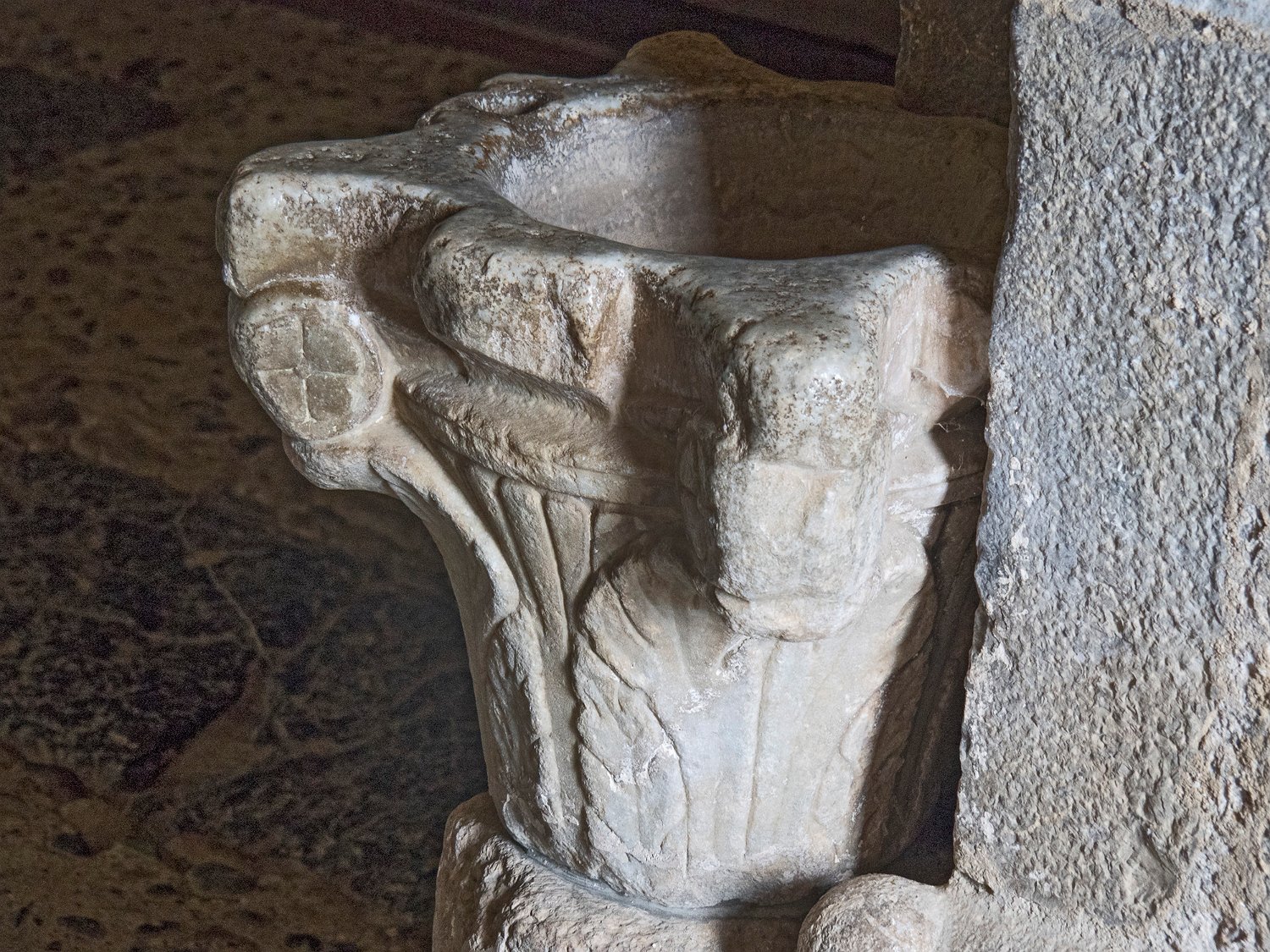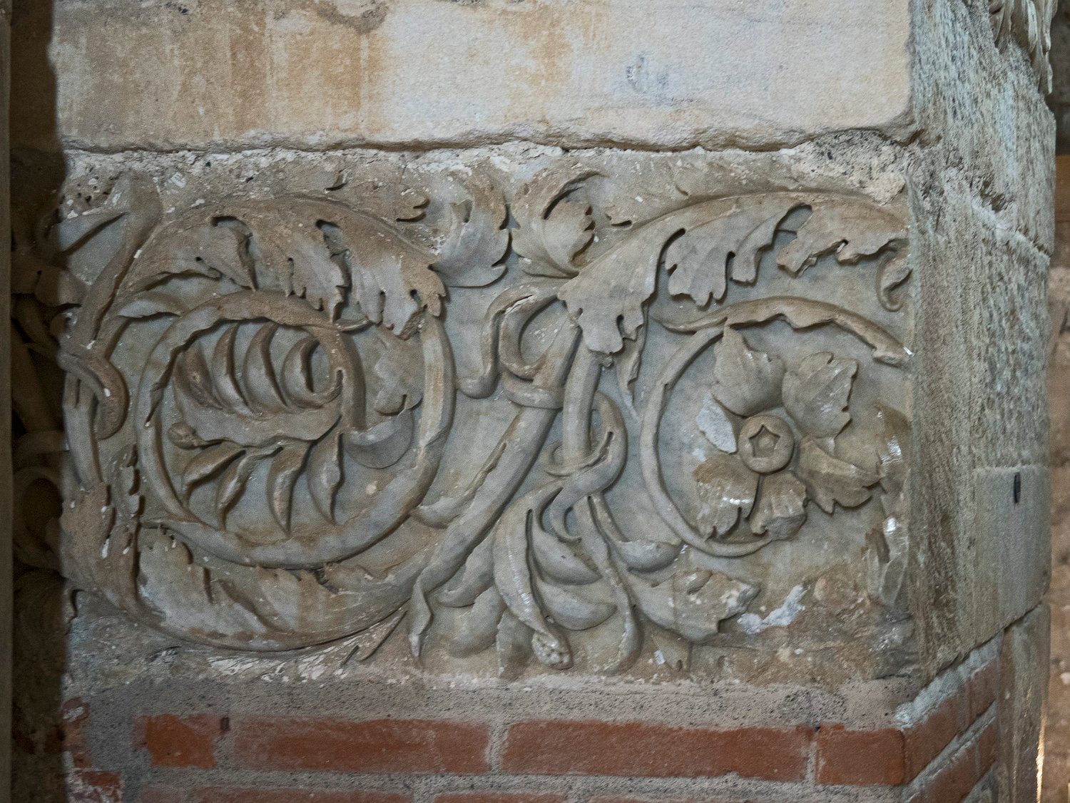 Outre les colonnes de l'abside, la construction de la basilique a utilisé de nombreuses pierres sculptées d'origine romaine (Lugdunum Convenarum) - Ici rosaces et acanthes enroulées