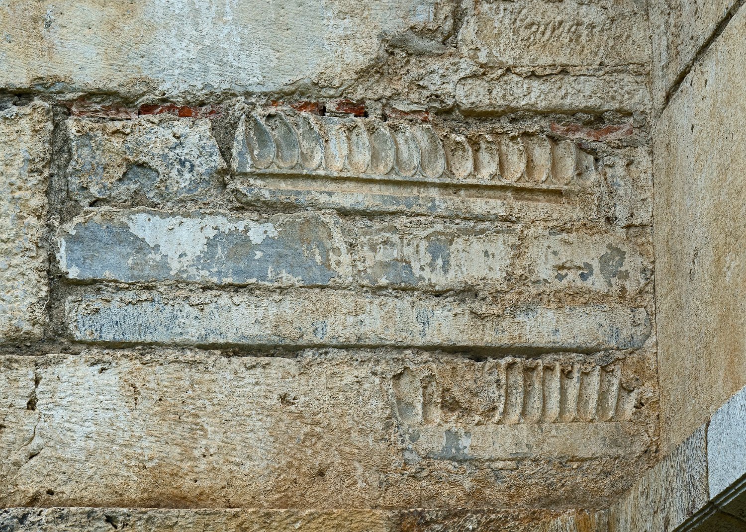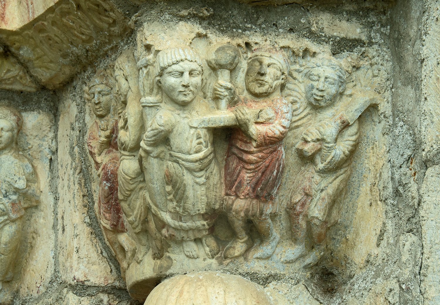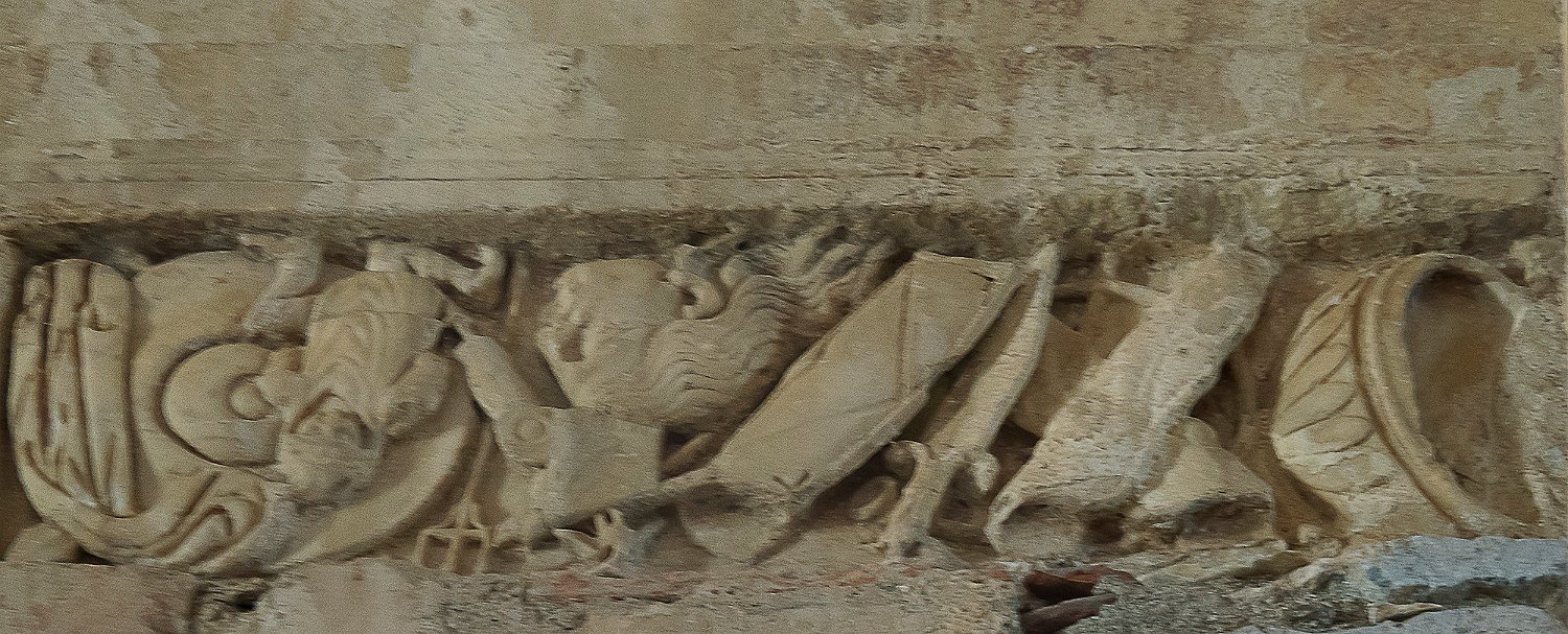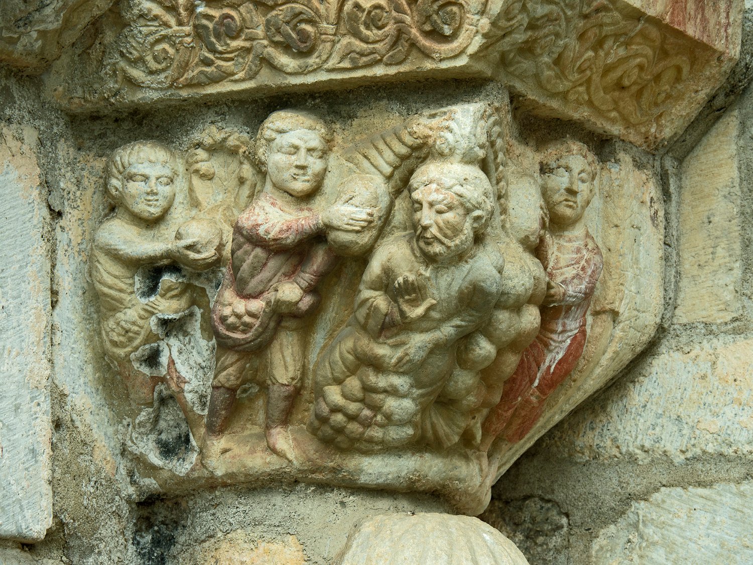 Outre les colonnes de l'abside, la construction de la basilique a utilisé de nombreuses pierres sculptées d'origine romaine (Lugdunum Convenarum) - Ici rosaces et acanthes enroulées