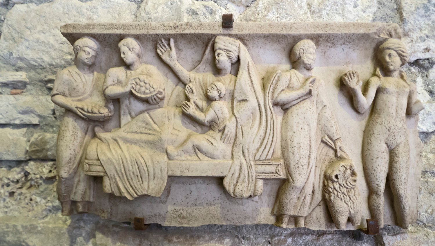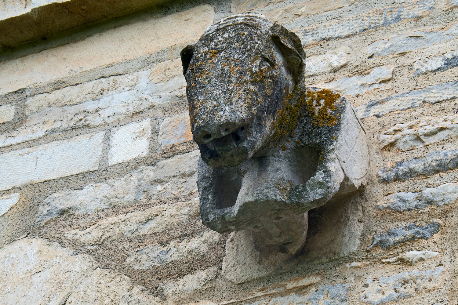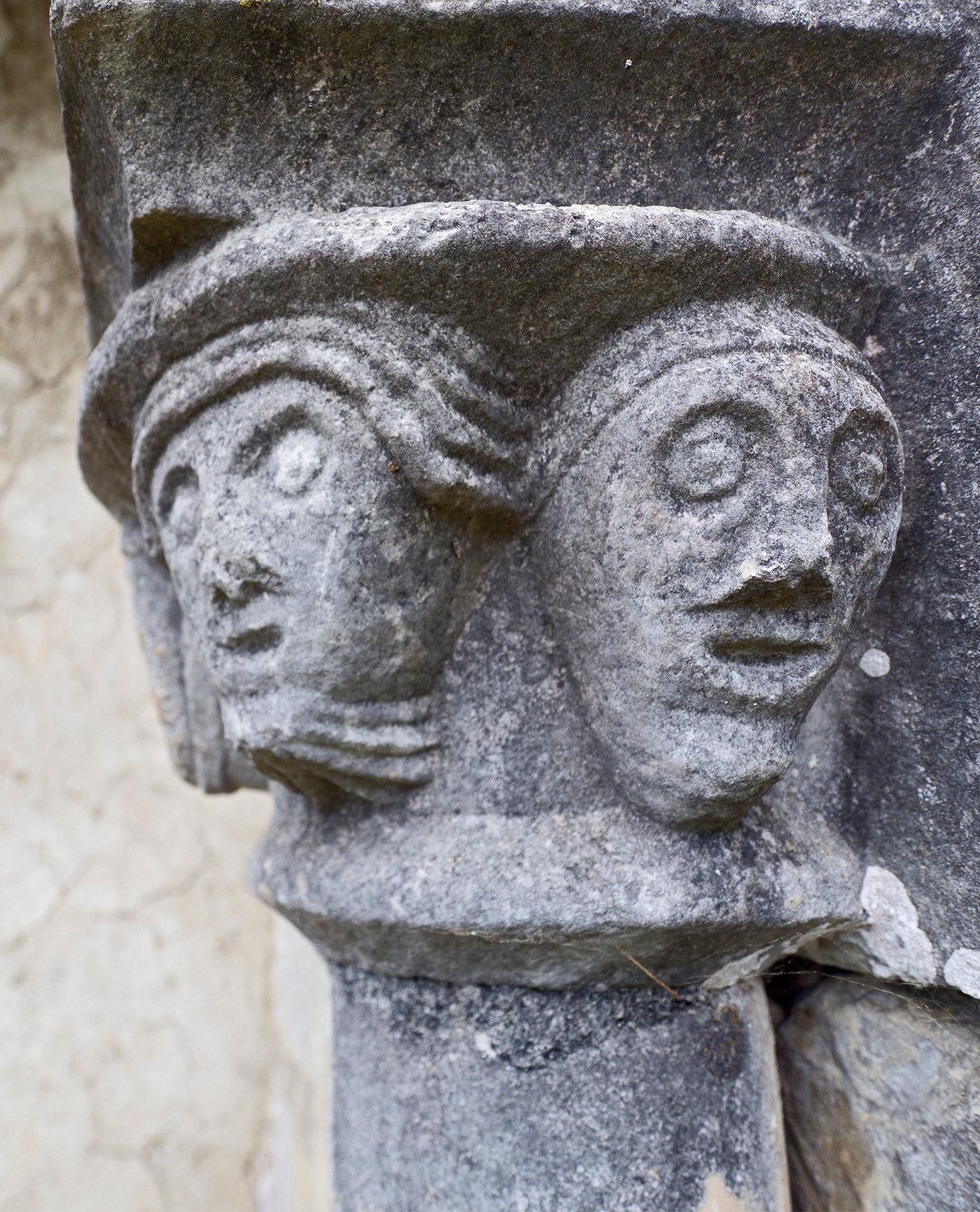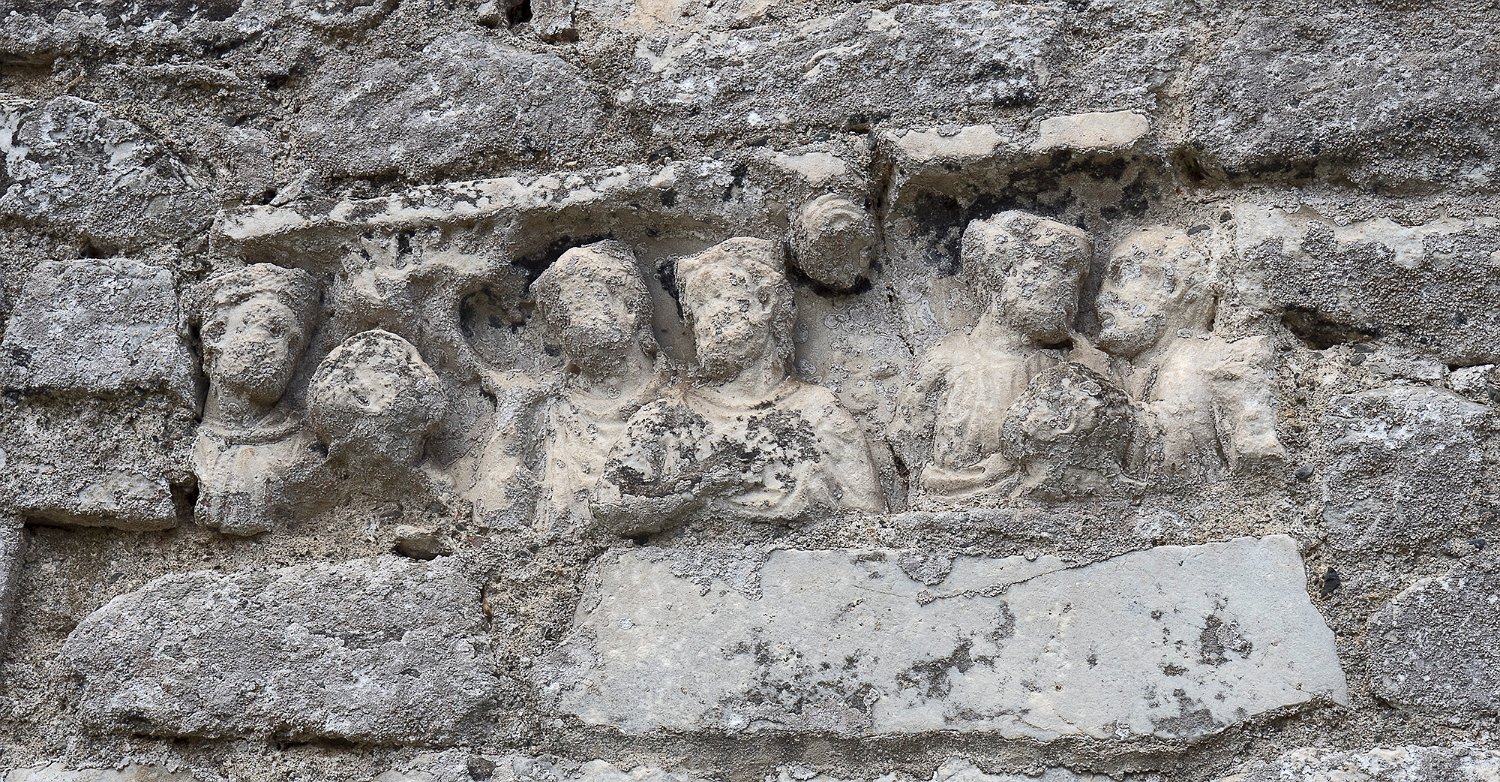 Sur la façade, pierre de réemploi comportant les bustes de 7 personnages
