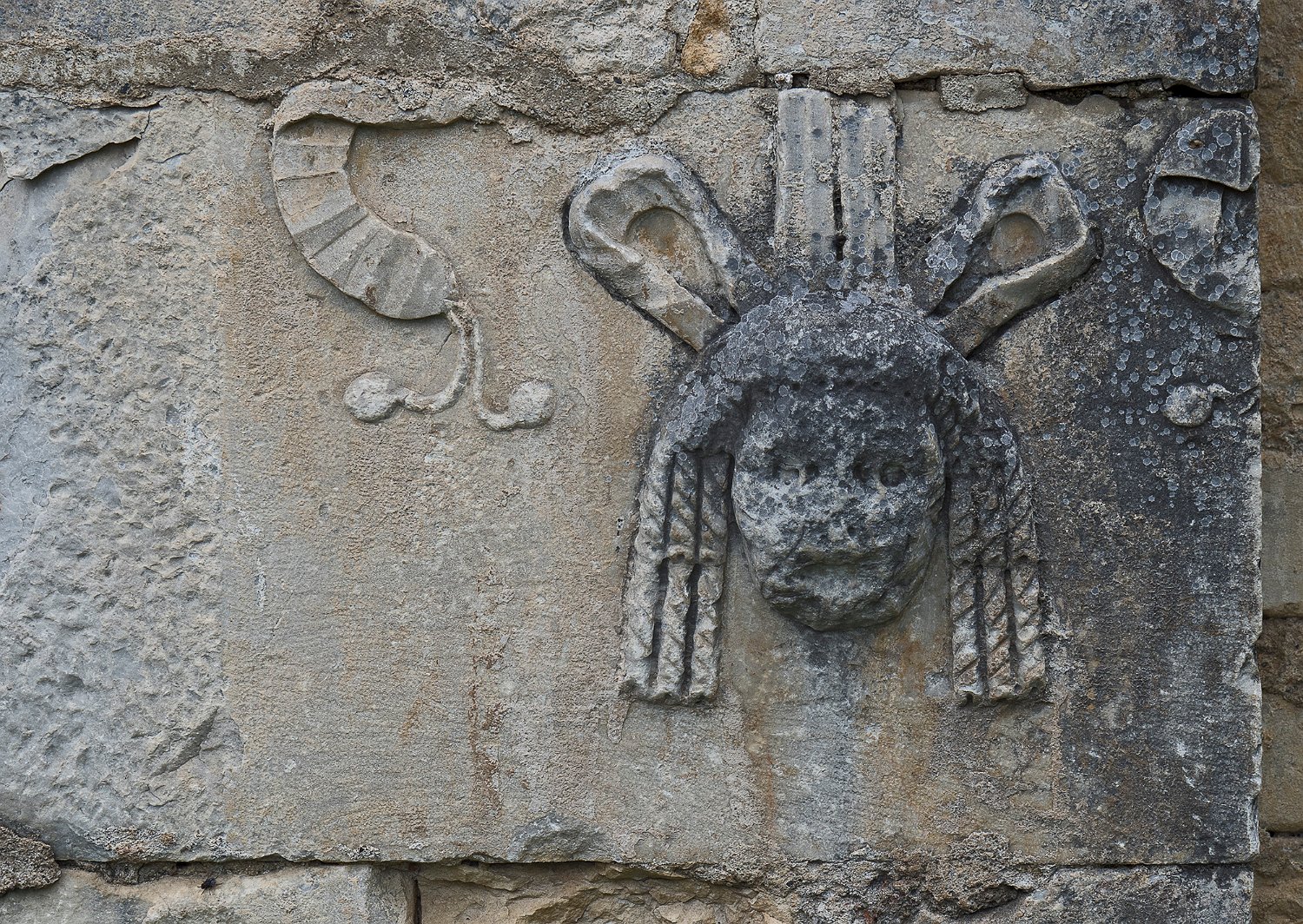 Sur la façade, pierre de réemploi (masque de théâtre)