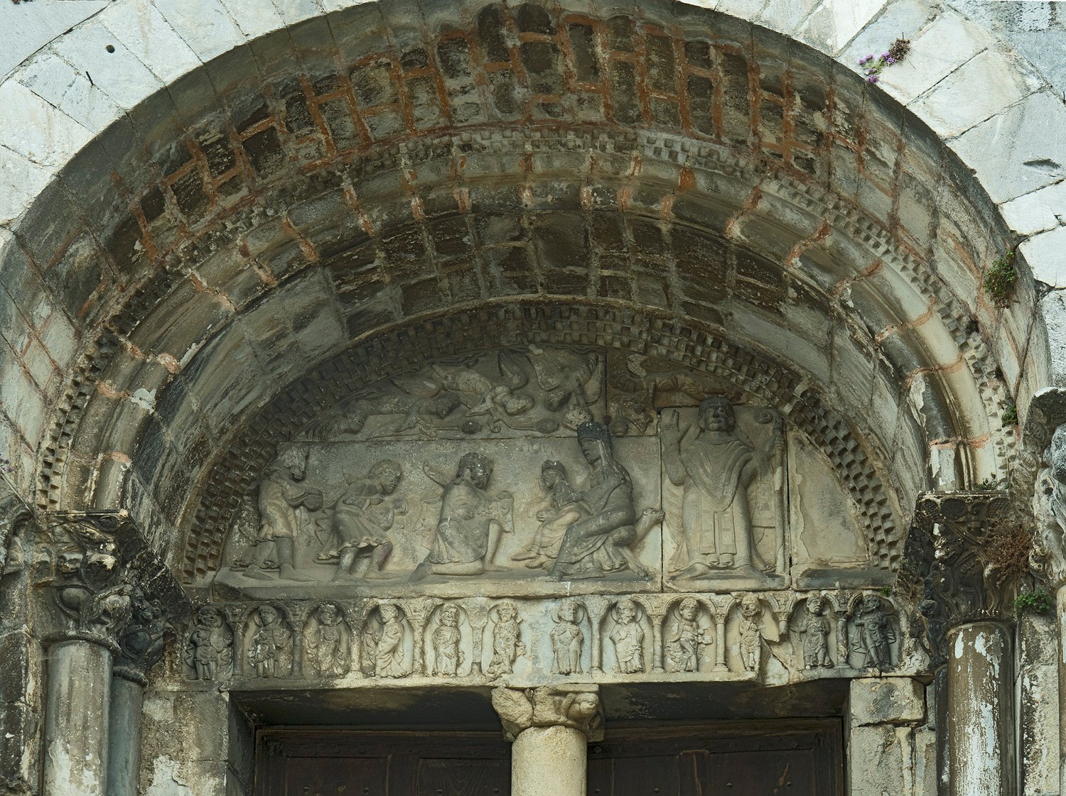 Tympan sculpté dans le marbre évoquant l'adoration des mages
