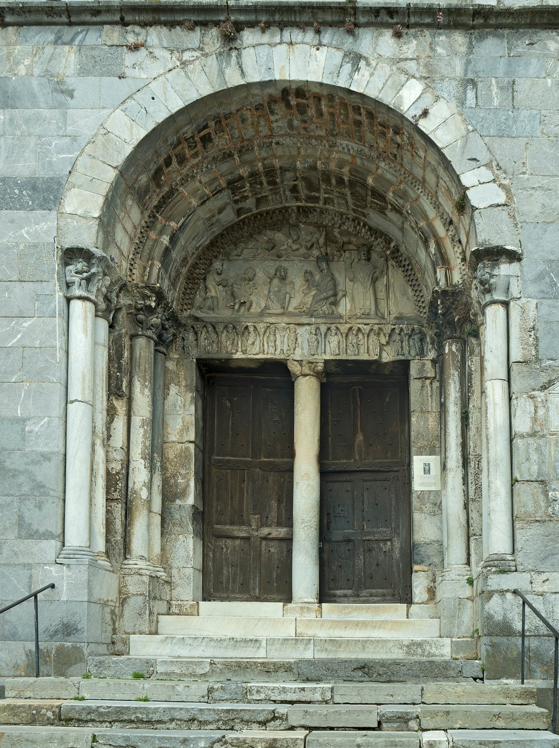 Portail roman à 2 entrées séparées par une colonne antique en réemploi