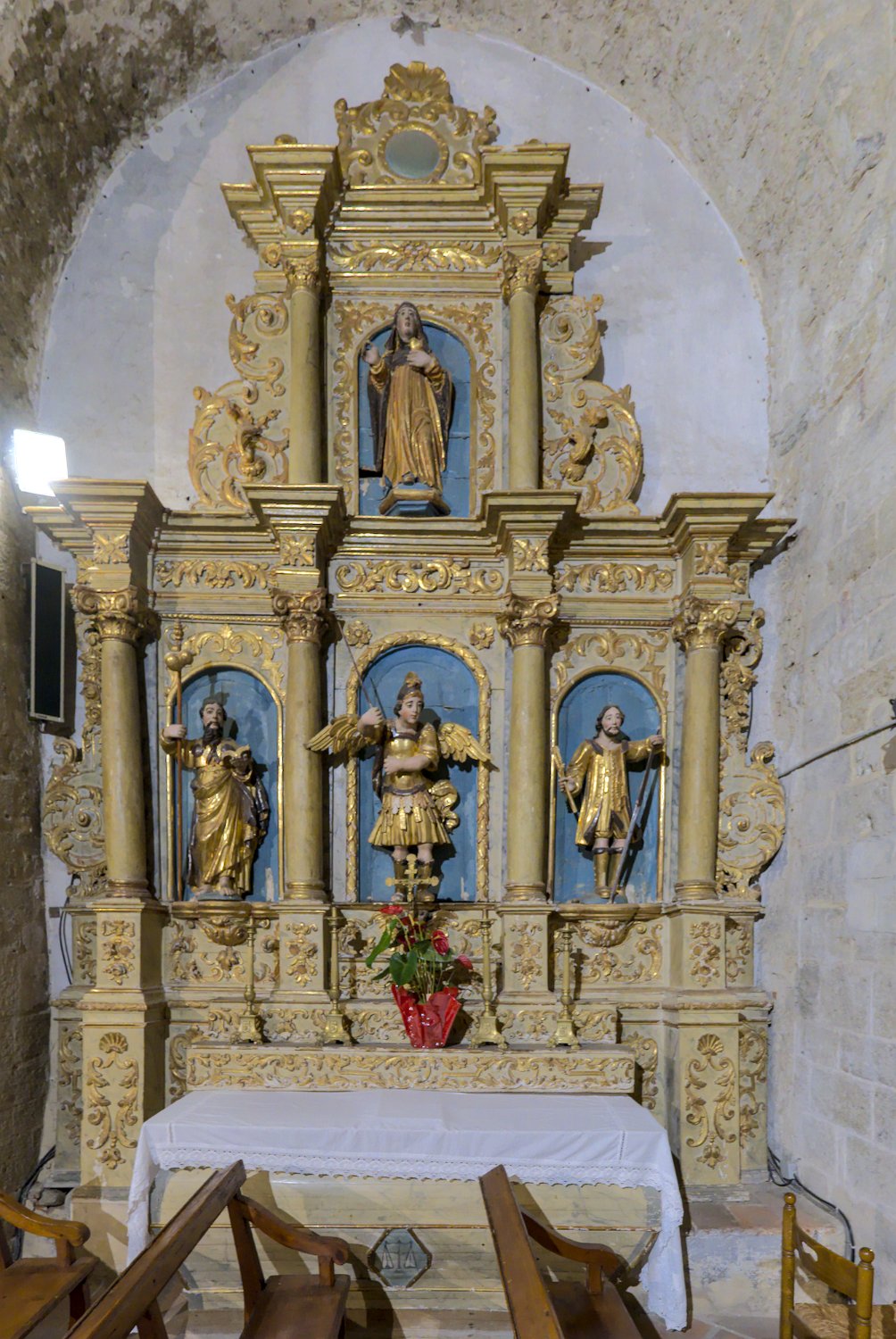 En haut, se trouve la statue de Ste Thérèse d'Avila, carmélite. Au centre, St Michel, à gauche St Jacques de Compostelle avec sa tenue de pèlerin, à droite St Gaudérique, patron des agriculteurs ou St Isidore, le Laboureur.