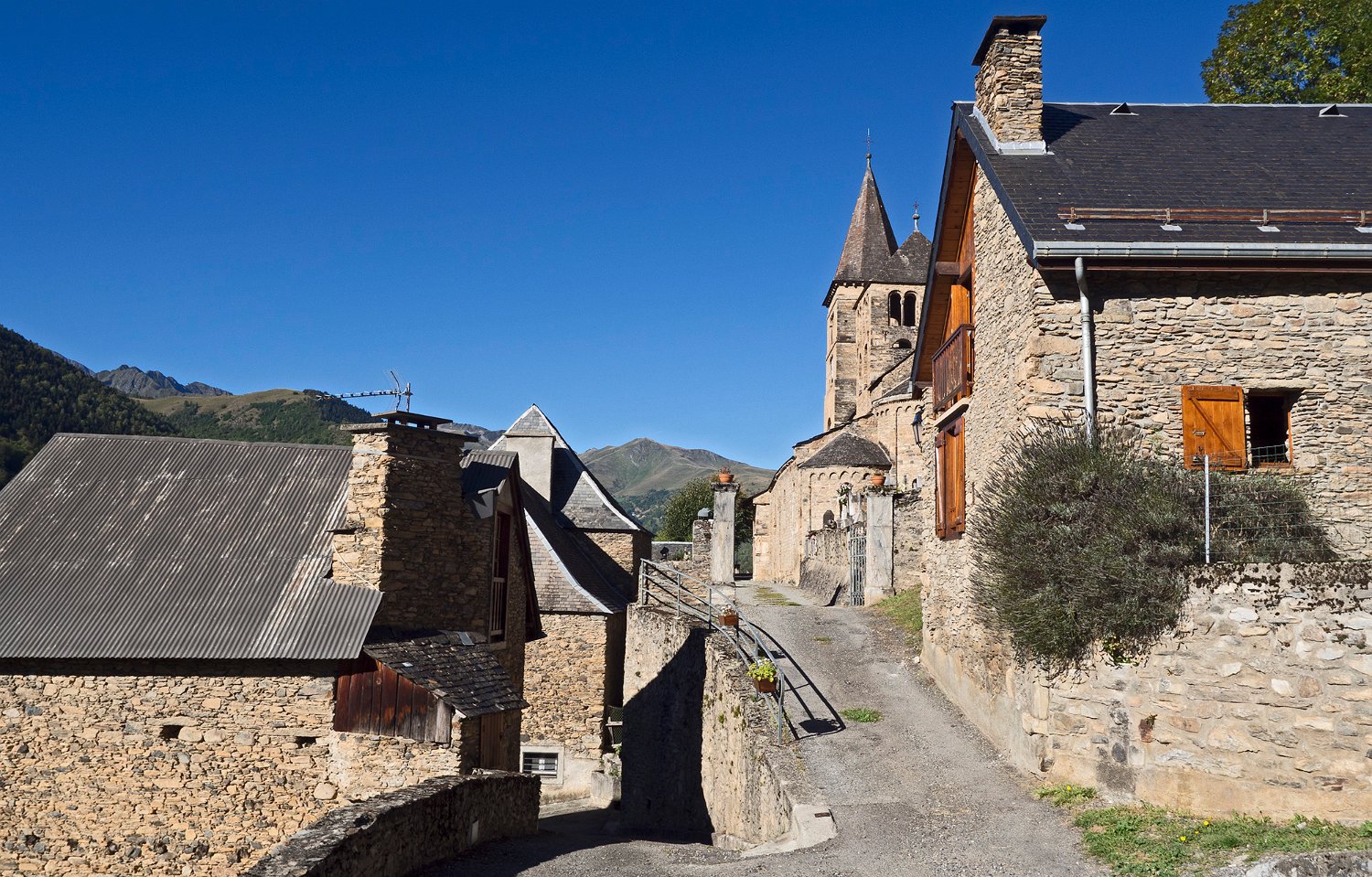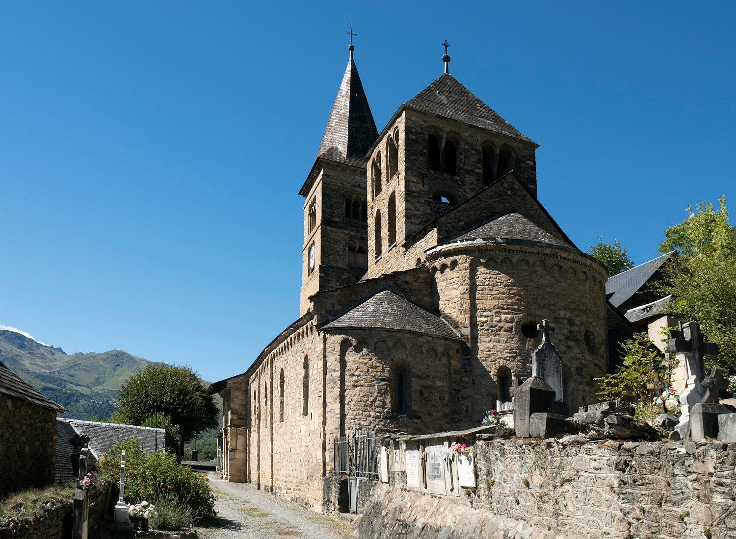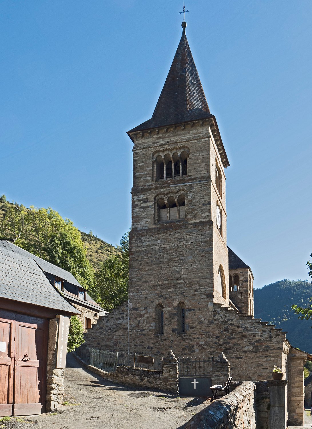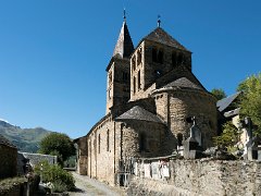 L'église romane Saint-Aventin date des XIe et XIIe siècles. Elle possède deux clochers, un porche orné de sculptures et des chapiteaux présentant des scènes de la vie et du martyre de saint Aventin. Les murs extérieurs ont incorporé des pierres provenant de bâtiments antérieurs : stèles et autels païens dédiés aux dieux pyrénéens, dont Abellio et Aherbelst. L'église est classée monument historique depuis 1840.
