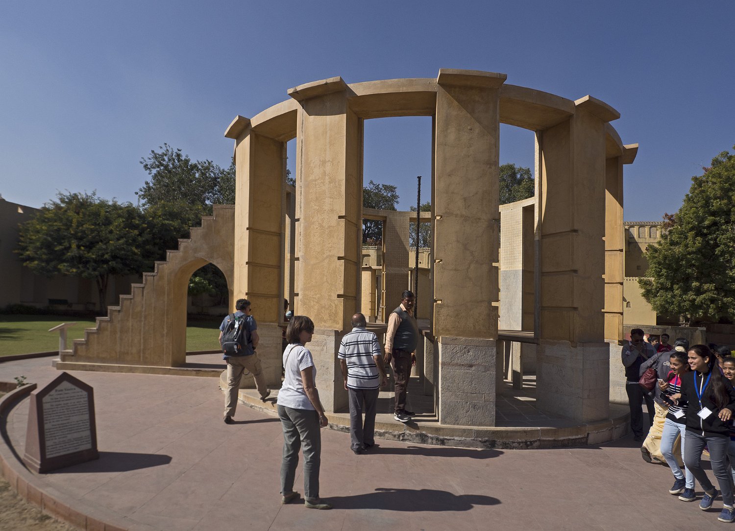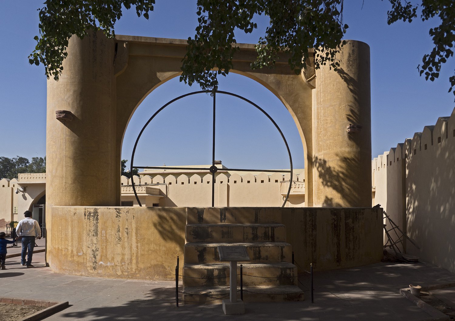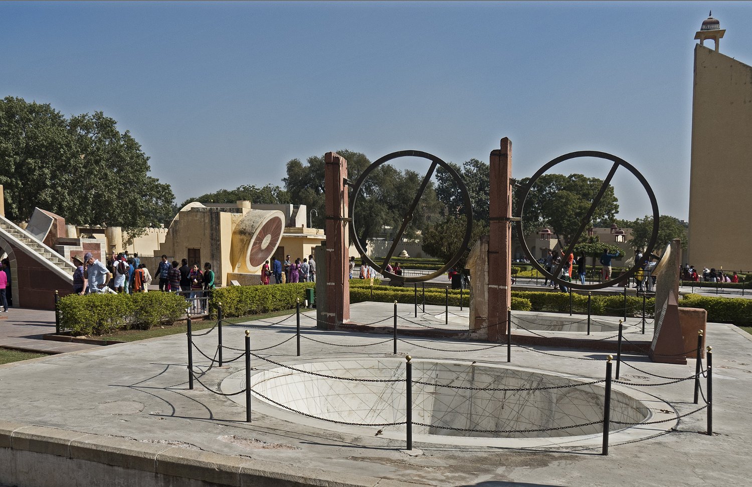 Le Rashivilaya Yantra - un des instruments  Un des douze cadrans Le petit Samrat Yantra (cadran solaire équatorial)  Il assure la même fonction que le grand mais permet une lecture plus rapide. Il est précis à 20 secondes près Le petit Samrat Yantra  On distingue les deux arcs latéraux gradués sur lesquels se lisait l'heure Le Raja Yantra  Il est constitué de deux disques  projetant une ombre sur la demi coupole au sol indiquant une position. Il sert de carte céleste