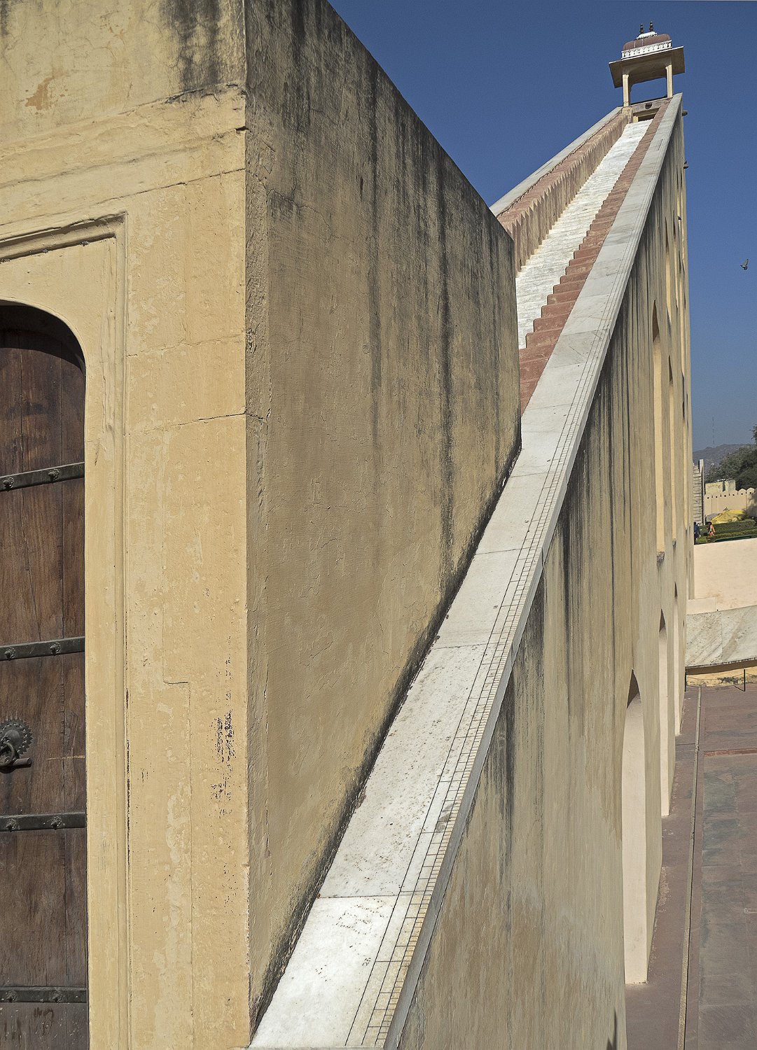 Vue d'ensemble de l'observatoire  Il comprend 17 instruments (tous ne figurent pas dans cet album) Le grand Samrat Yantra (cadran solaire) vue de côté  Il s'agit d'un énorme quadran solaire de 33m de hauteur totale. Précis à 2 secondes près Le grand Samrat Yantra (cadran solaire)  La partie haute est le gnomon. On distingue également un des arcs latéraux Le grand Samrat Yantra - la colonne centrale (gnomon)  Le gnomon projète son ombre sur les arcs latéraux pour donner l'heure. Il mesure 27,45 m de haut et est incliné de 27°.