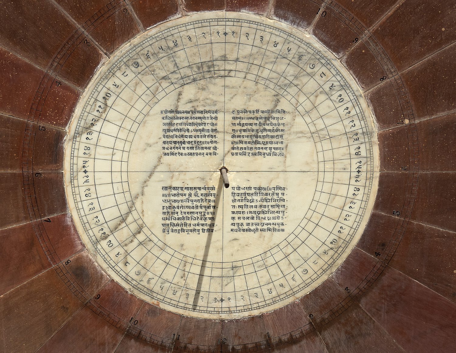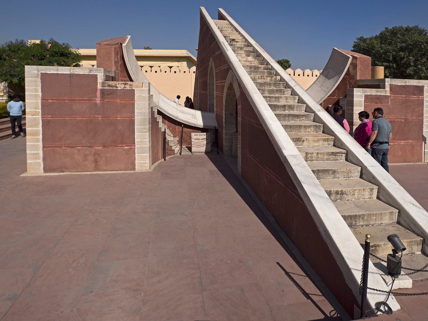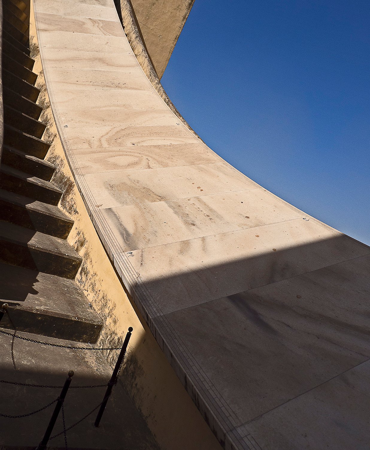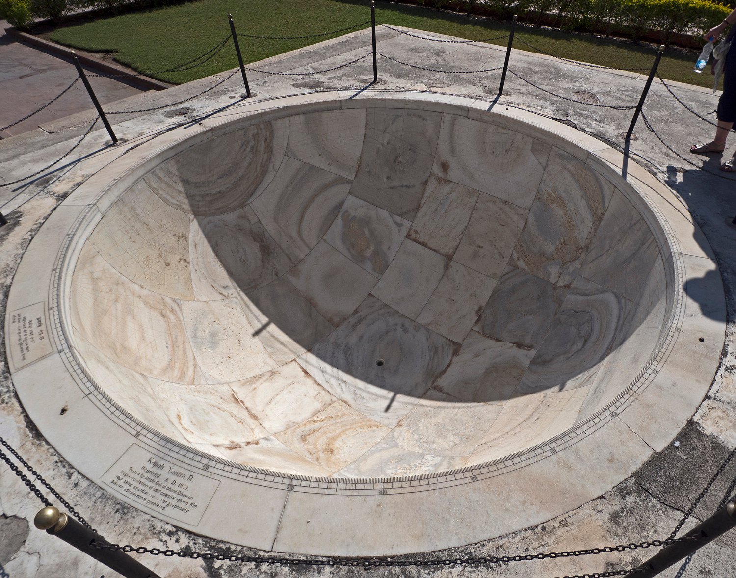 Le grand Samrat Yantra - un des deux arcs latéraux  Les deux arcs latéraux (un pour le matin, l'autre pour l'après-midi) sont gradués en heure, minutes et secondes. Ils font 15 m de longueur. L'ombre du soleil s'y déplace de 4m par heure Le grand Samrat Yantra - graduations sur les arcs latéraux et lecture de l'heure à partir de l'ombre  Une astuce utilisant une aiguille permettait une lecture précise de l'heure malgré la diffraction de l'ombre sur les graduations Le Jai Prakash Yantra  Cet instrument permet de suivre la course du soleil dans le zodiaque. Le petit disque percé suspendu au centre donne une image du soleil sur les plaques de marbre finement gravées.Chaque portion blanche correspond à une heure d'observation (il y a un 2ème instrument qui compense les "trou" de cette sphère). Les intervalles entre les portions permettaient à l'observateur une vision plus précise. Sous les plaques, des gradins permettaient de s'asseoir pour être plus à l'aise. Le Rashivilaya Yantra.  Il comprend 12 quadrans solaires correspondant à la position du soleil lors de son entrée dans un signe du zodiaque. Chaque quadran permet de relever les coordonnées elliptiques