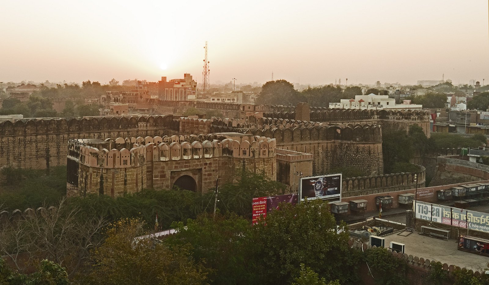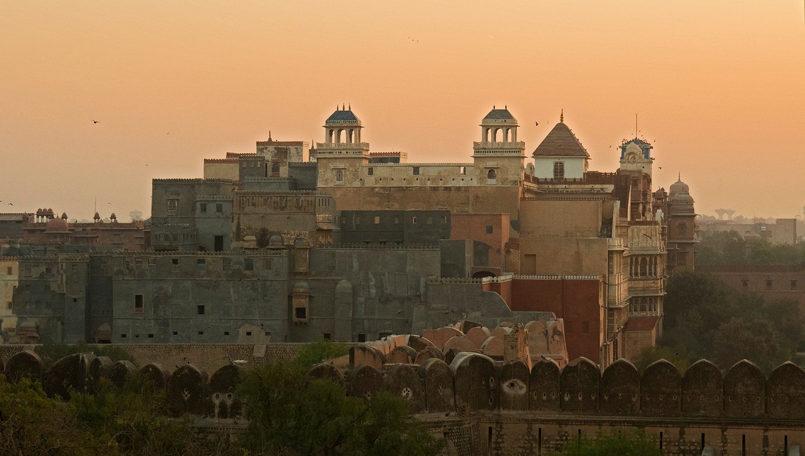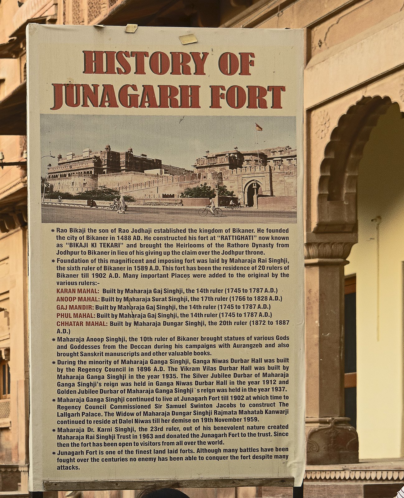 Situé à Bikaner, le fort Junagarh est l'un des forts les plus complexes d'Inde. Les fondations du fort Junagarh ont été construites en 1478 par Rao Bika, qui donna son nom à la ville de Bikaner. Le fort de Junagarh a ensuite été construit sur cette base par Raja Rai Singh entre 1588 et 1593. C'est le seul fort construit en plaine. Ce fort abrite plusieurs palais qui ont été chacun construits par un souverain différent au cours des siècles jusqu'au début du XXème. Ce fort est un bel exemple d'architecture moghole.