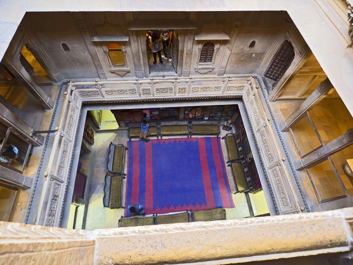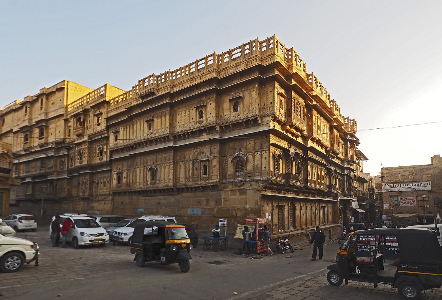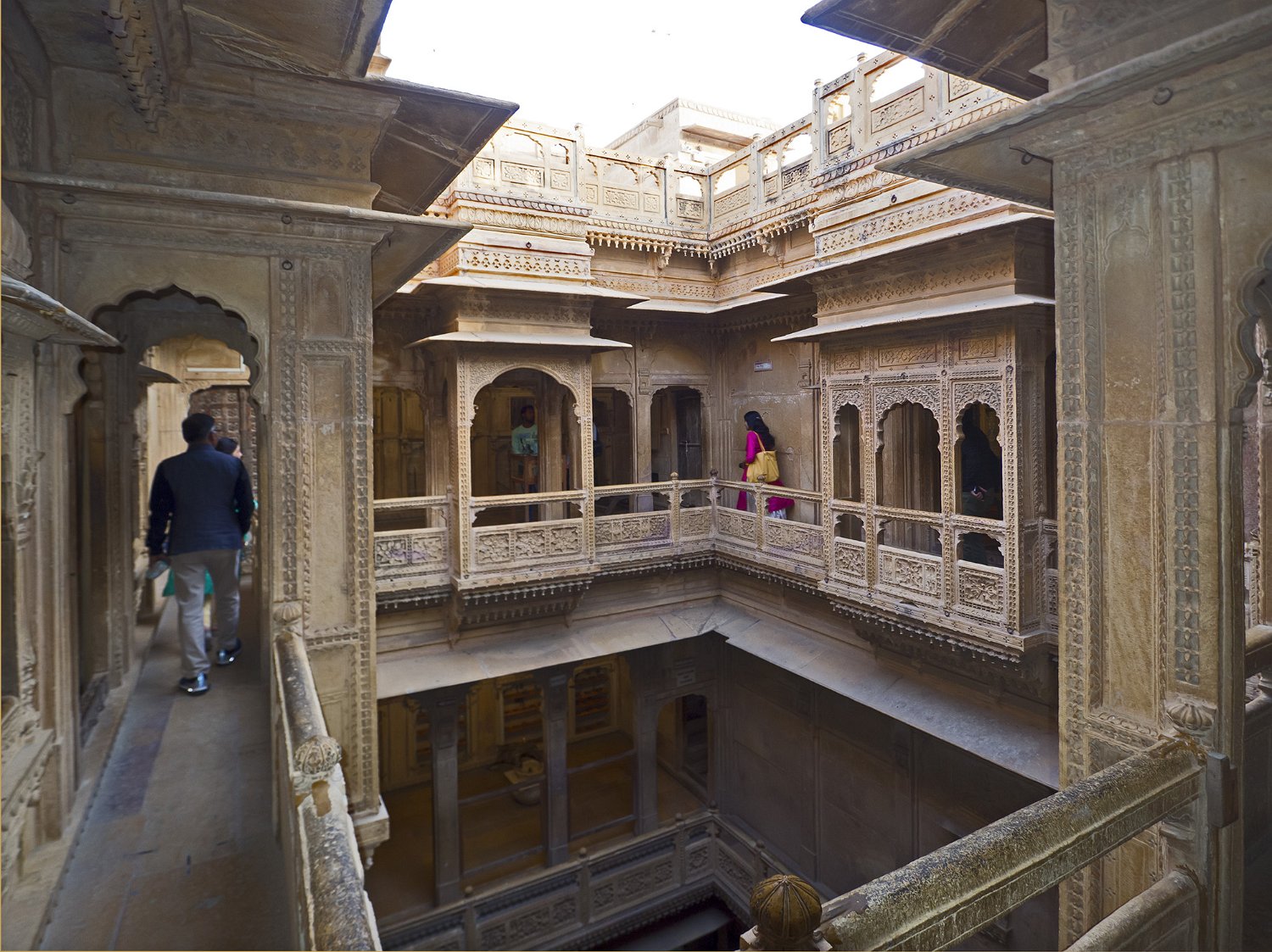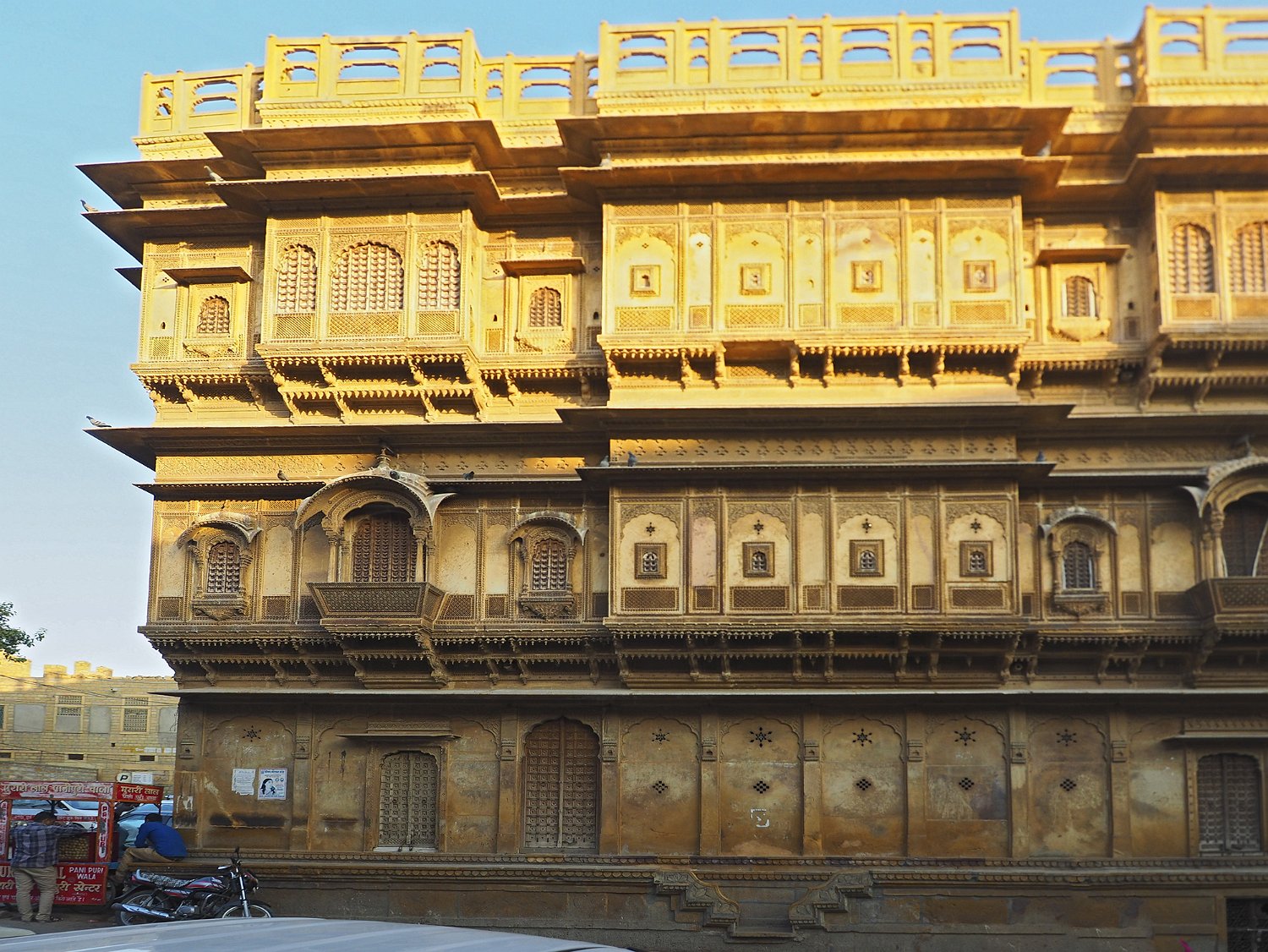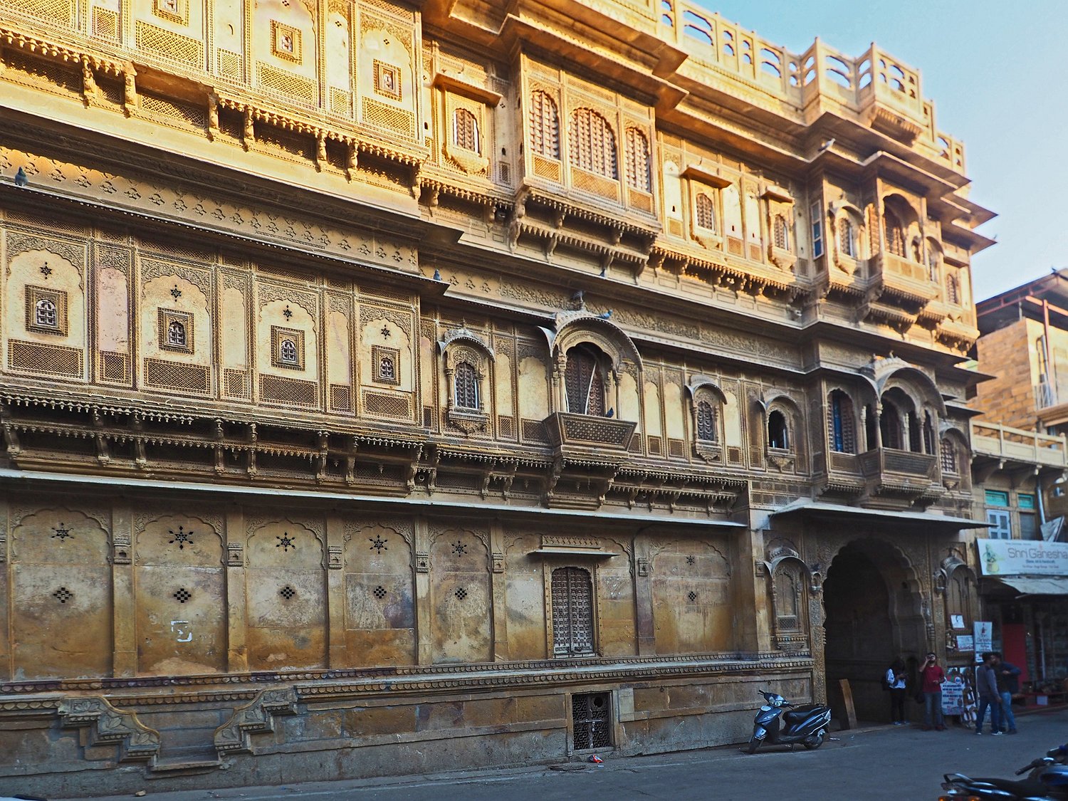 Vue du Haveli depuis la forteresse  Le Patwon ki Haveli est le plus important et le plus grand haveli de  Jaisalmer. Ce n'est pas un seul haveli mais un groupe de cinq petits havelis. Le premier d'entre eux, le plus grand et le plus grandiose, a été commandé et construit en 1805 par Guman Chand Patwa, alors riche négociant de bijoux et de brocart. Vue d'ensemble du Haveli  Construit en grès jaune ce haveli est surtout connu pour ses beaux jalis (claustras) en pierre et en bois sur ses fenêtres et ses balcons finement ouvragés. Façade Façade