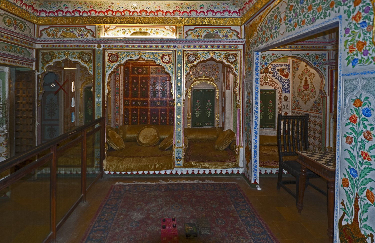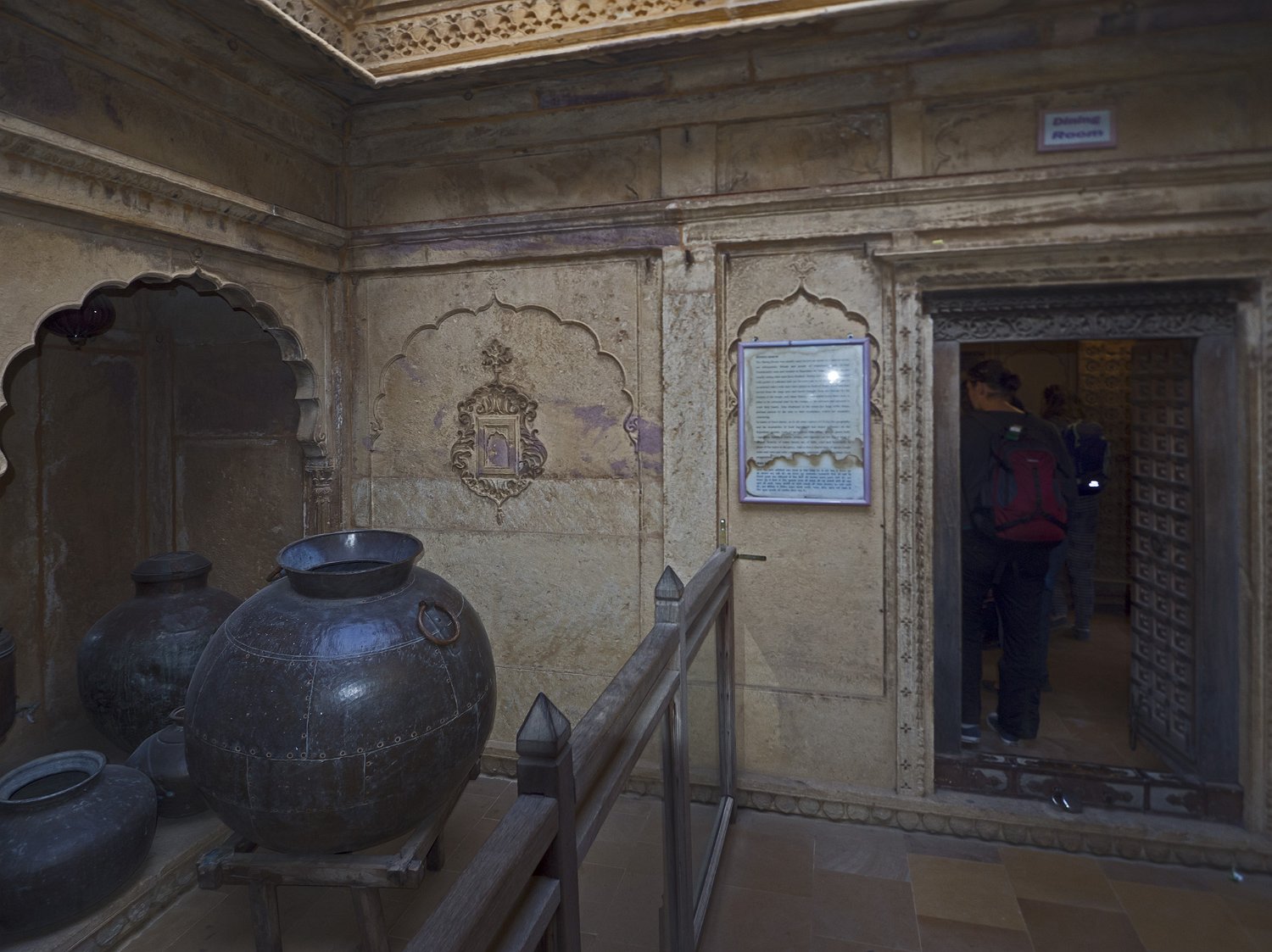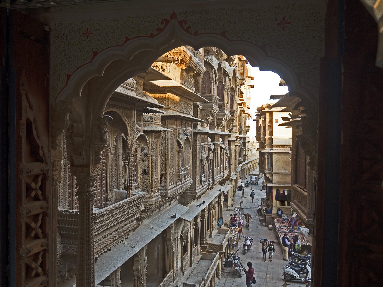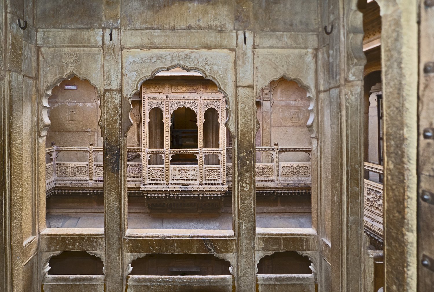 Vue du Haveli depuis la forteresse  Le Patwon ki Haveli est le plus important et le plus grand haveli de  Jaisalmer. Ce n'est pas un seul haveli mais un groupe de cinq petits havelis. Le premier d'entre eux, le plus grand et le plus grandiose, a été commandé et construit en 1805 par Guman Chand Patwa, alors riche négociant de bijoux et de brocart. Vue d'ensemble du Haveli  Construit en grès jaune ce haveli est surtout connu pour ses beaux jalis (claustras) en pierre et en bois sur ses fenêtres et ses balcons finement ouvragés. Façade Façade