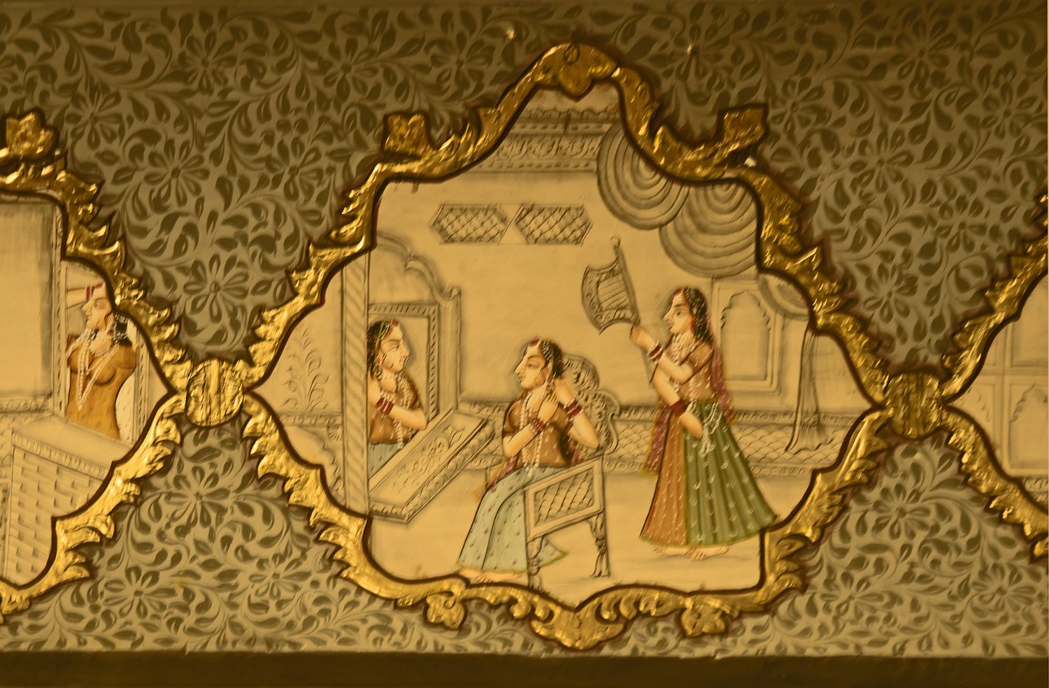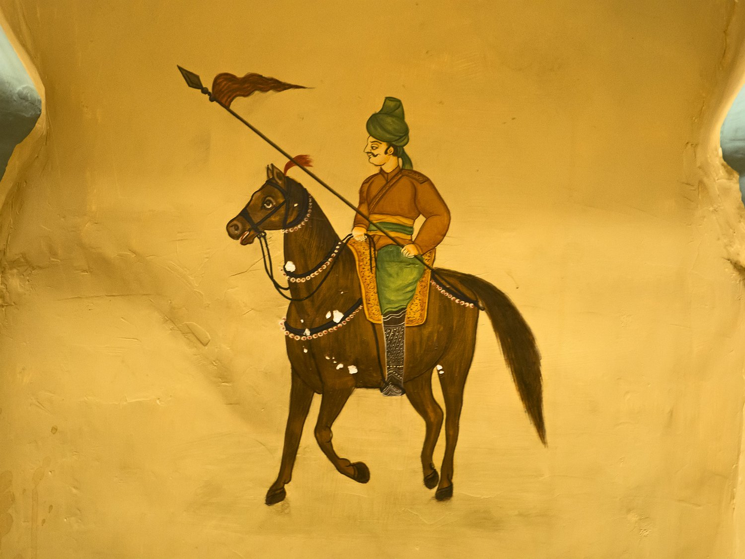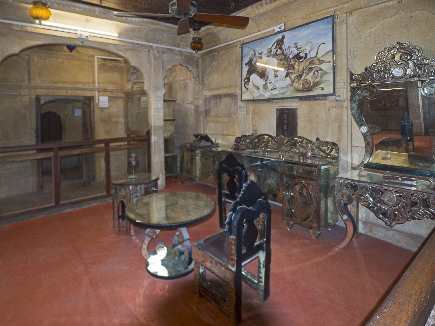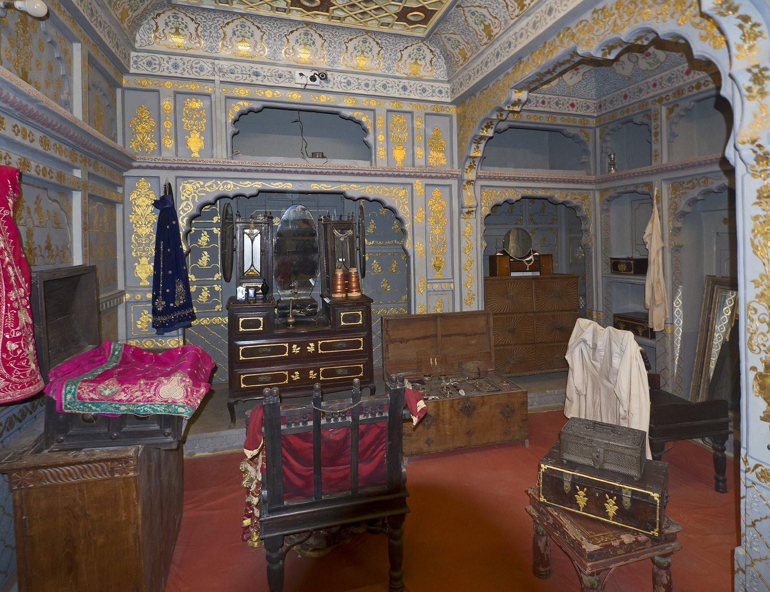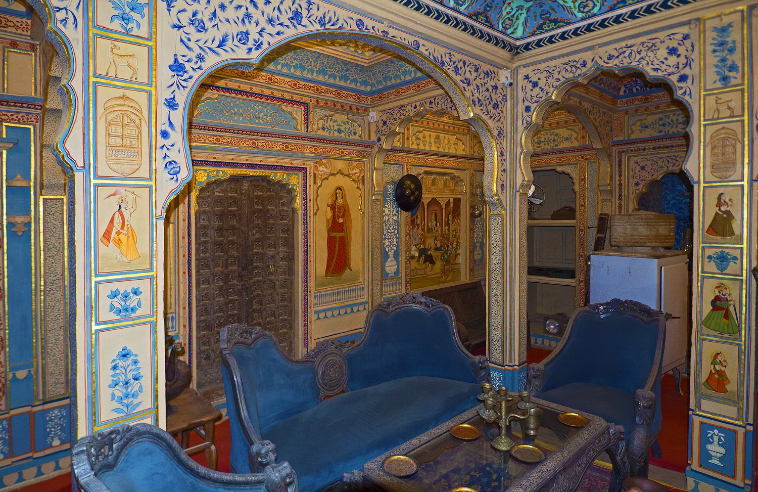 Vue du Haveli depuis la forteresse  Le Patwon ki Haveli est le plus important et le plus grand haveli de  Jaisalmer. Ce n'est pas un seul haveli mais un groupe de cinq petits havelis. Le premier d'entre eux, le plus grand et le plus grandiose, a été commandé et construit en 1805 par Guman Chand Patwa, alors riche négociant de bijoux et de brocart. Vue d'ensemble du Haveli  Construit en grès jaune ce haveli est surtout connu pour ses beaux jalis (claustras) en pierre et en bois sur ses fenêtres et ses balcons finement ouvragés. Façade Façade