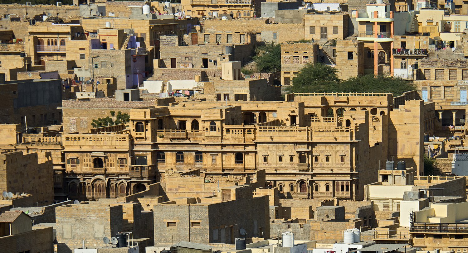 La ville de Jaisalmer a été fondée en 1156 par Rawal Jaisal. La ville doit sa richesse à sa position sur la route des caravanes allant de l'Inde à la Perse. Sa forteresse surplombe le désert du Thar et est protégée par une enceinte de 5 km. Outre sa forteresse, la ville est connue pour ses havelis, des maisons de riches marchands du 18eme siècle, parfois véritables petits palais, aux façades de pierre finement sculptées. Le Patwon ki Haveli est le plus grand et le plus beau d'entre eux.