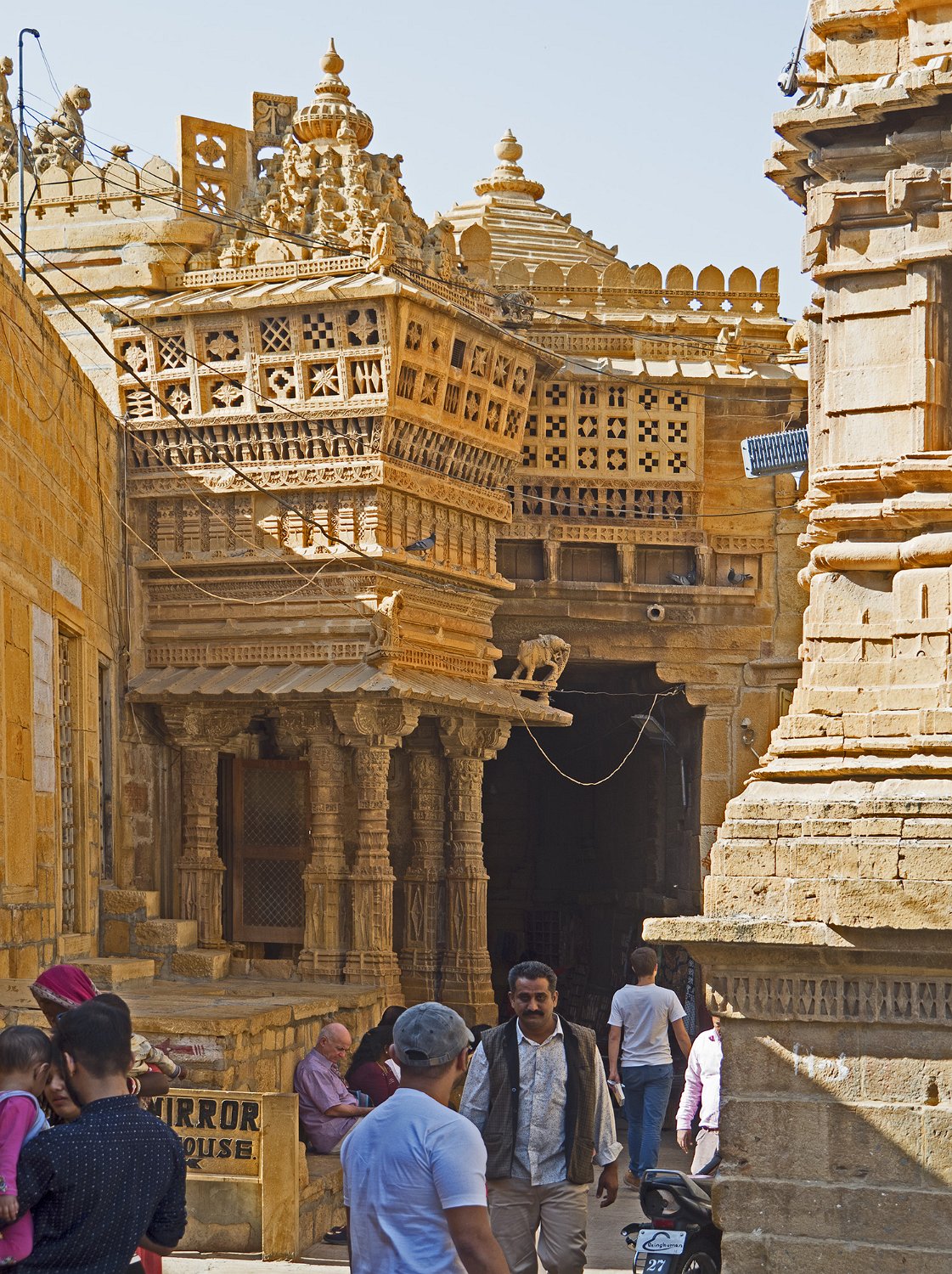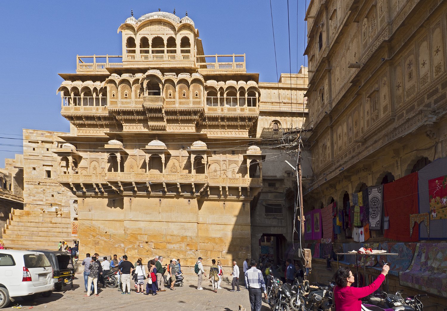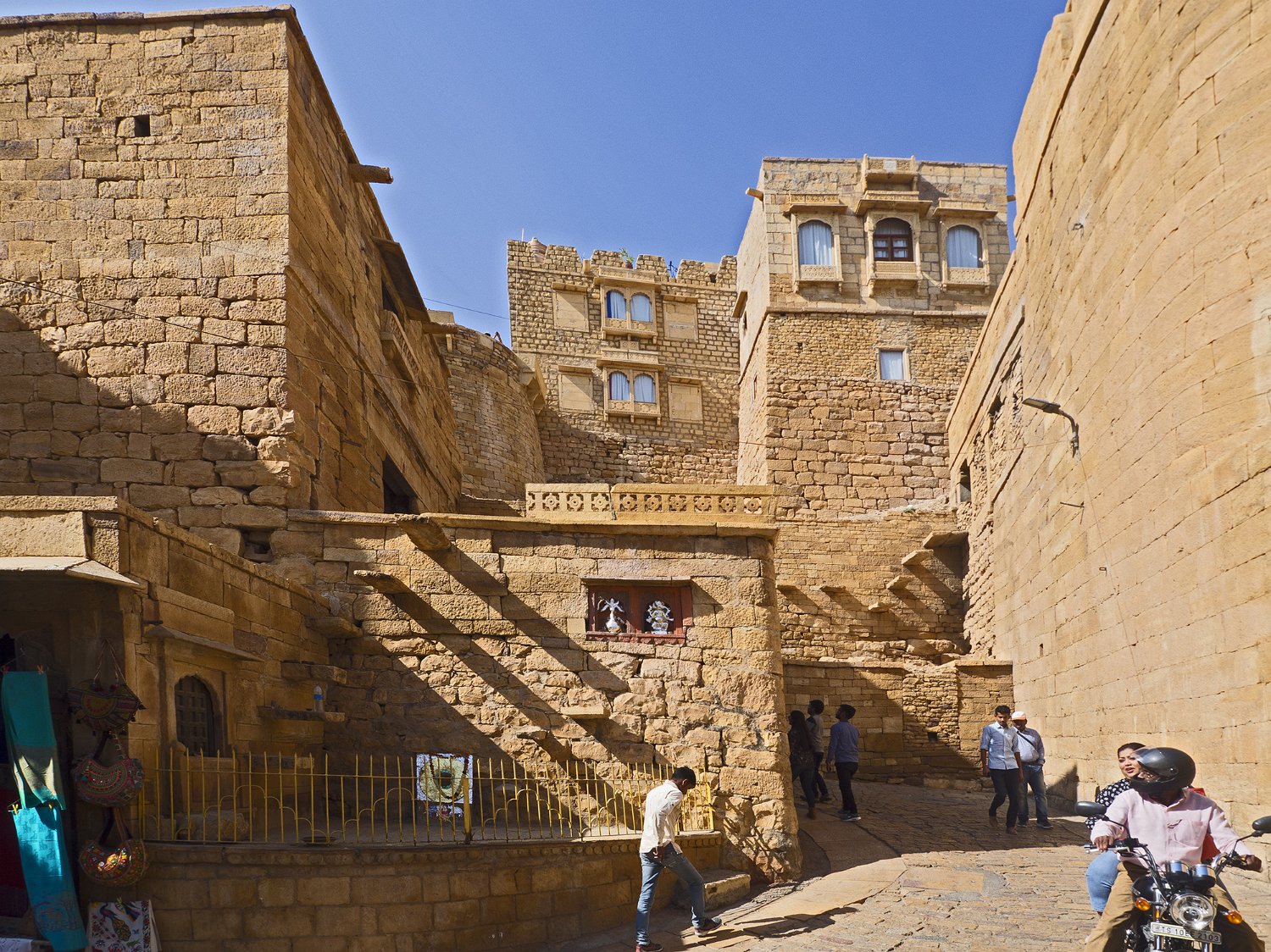 Rampe d'accès à une des portes de la citadelle Façade du palais royal (Moti Mahal) et place royale  La place correspond à l'ancienne cour du palais qui servait à la revue des troupes Vue du palais royal et des remparts depuis Patwon Ki Haveli  Patwon Ki Haveli est un haveli situé dans la vile nouvelle de Jaisalmer Façade arrière du palais royal