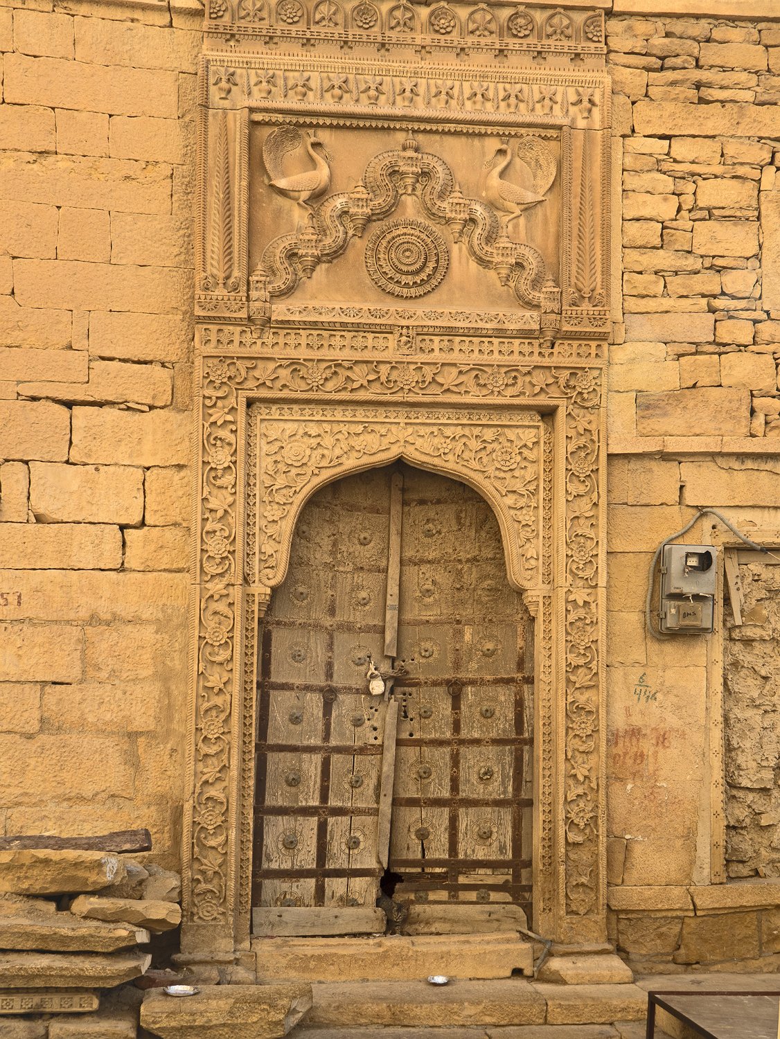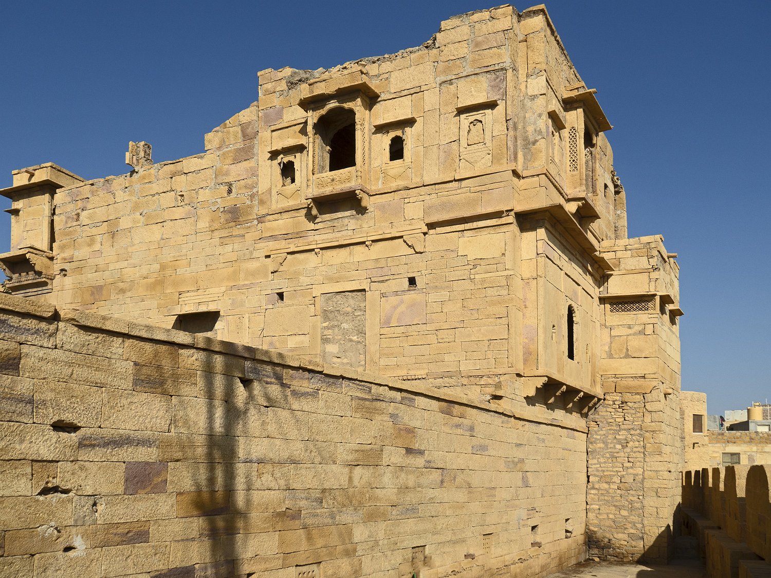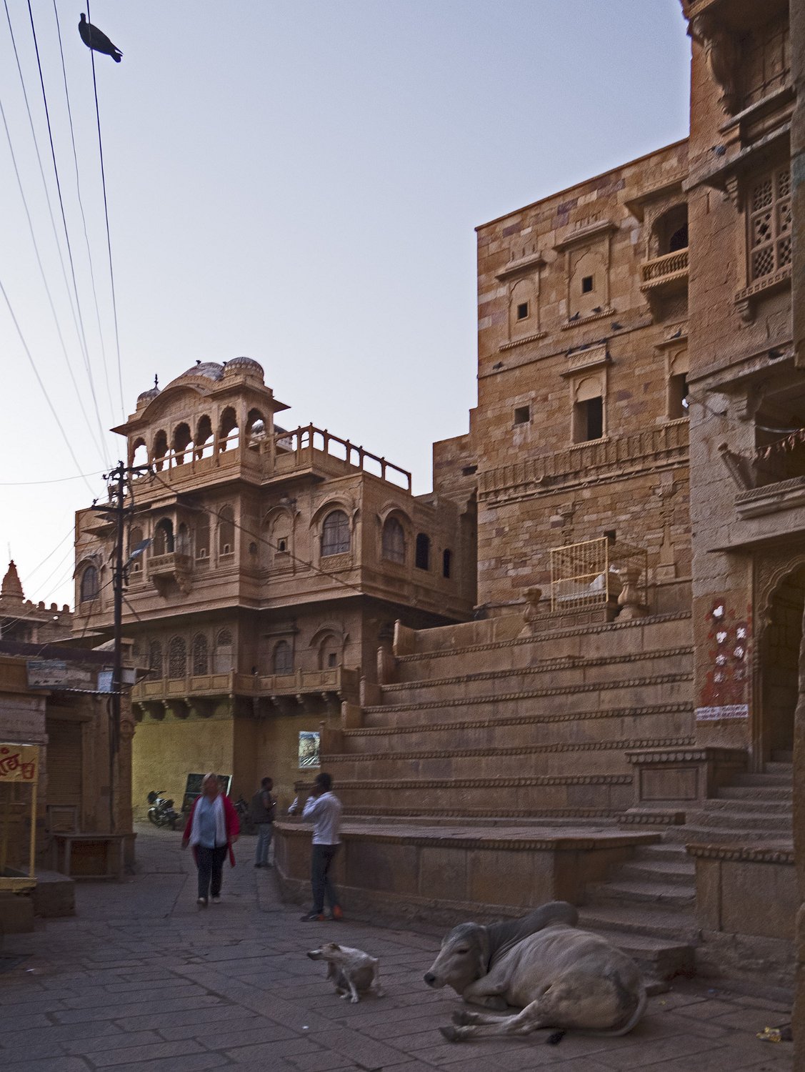Rampe d'accès à une des portes de la citadelle Façade du palais royal (Moti Mahal) et place royale  La place correspond à l'ancienne cour du palais qui servait à la revue des troupes Vue du palais royal et des remparts depuis Patwon Ki Haveli  Patwon Ki Haveli est un haveli situé dans la vile nouvelle de Jaisalmer Façade arrière du palais royal