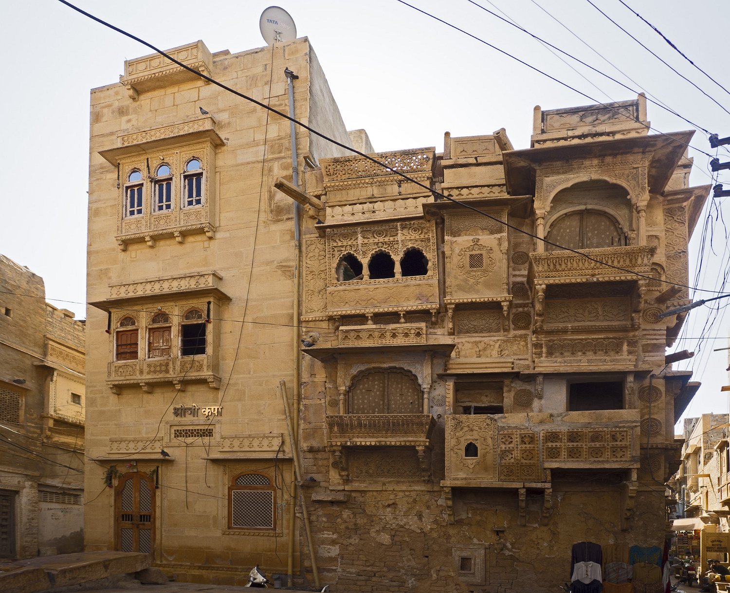 Vue sur les décorations d'un temple jaïn Haveli  Ces splendides demeures de grès ont été bâties par les négociants fortunés de Jaisalmer pendant la période de la route de la soie Haveli  Les havelis sont construits suivant une architecture permettant de retenir un maximum de fraicheur par une optimisation de la ventilation Haveli