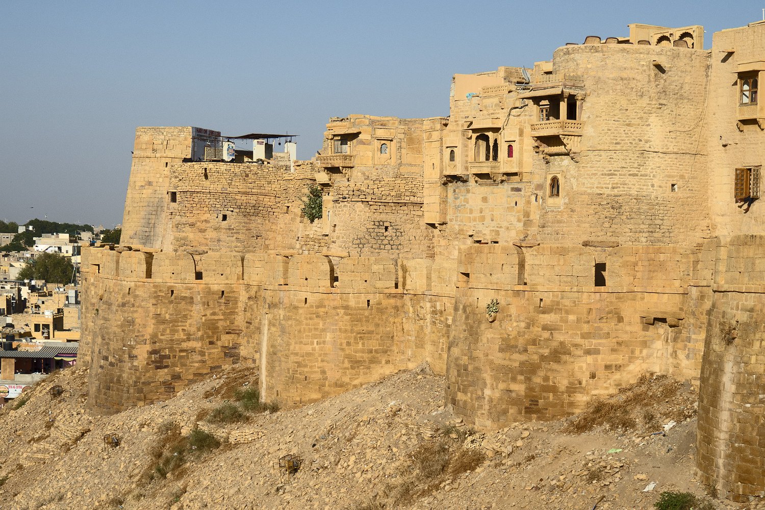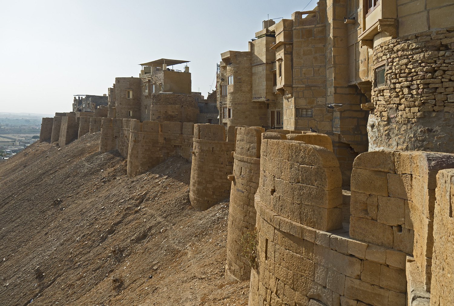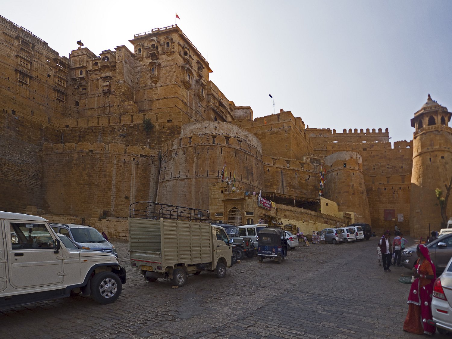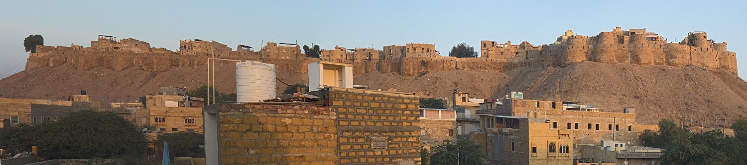 Vue panoramique sur la citadelle  La citadelle est construite sur une colline (Trikuta) de 80m de haut qui domine la ville de Jaisalmer La citadelle depuis Patwon Ki Haveli  La citadelle est encore habitée par près de 3000 personnes. Seules les deux castes les plus hautes peuvent résider dans la citadelle Entrée de la citadelle Rampe d'accès  La citadelle est défendue par 5 portes disposées en quinconce pour une meilleure défense