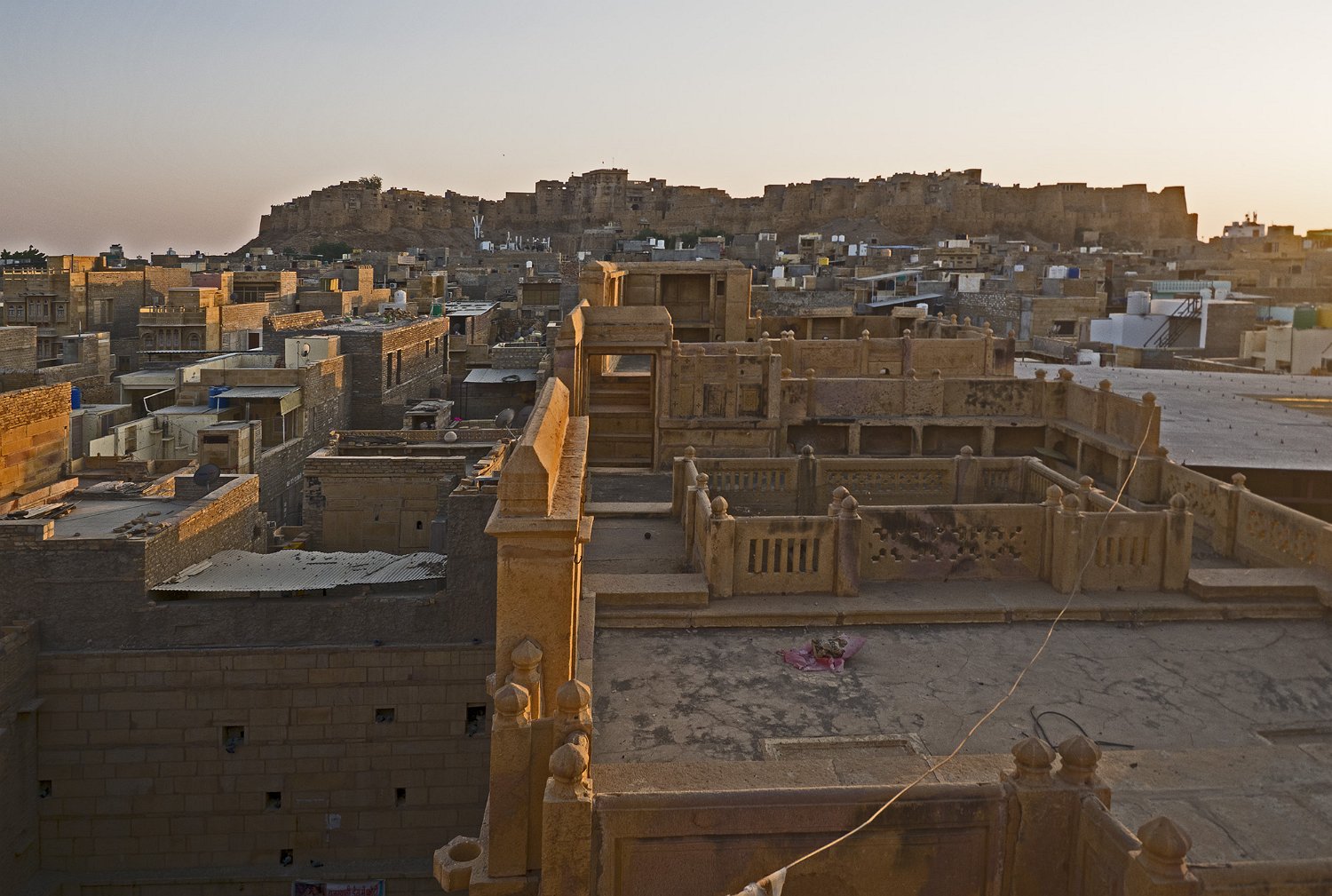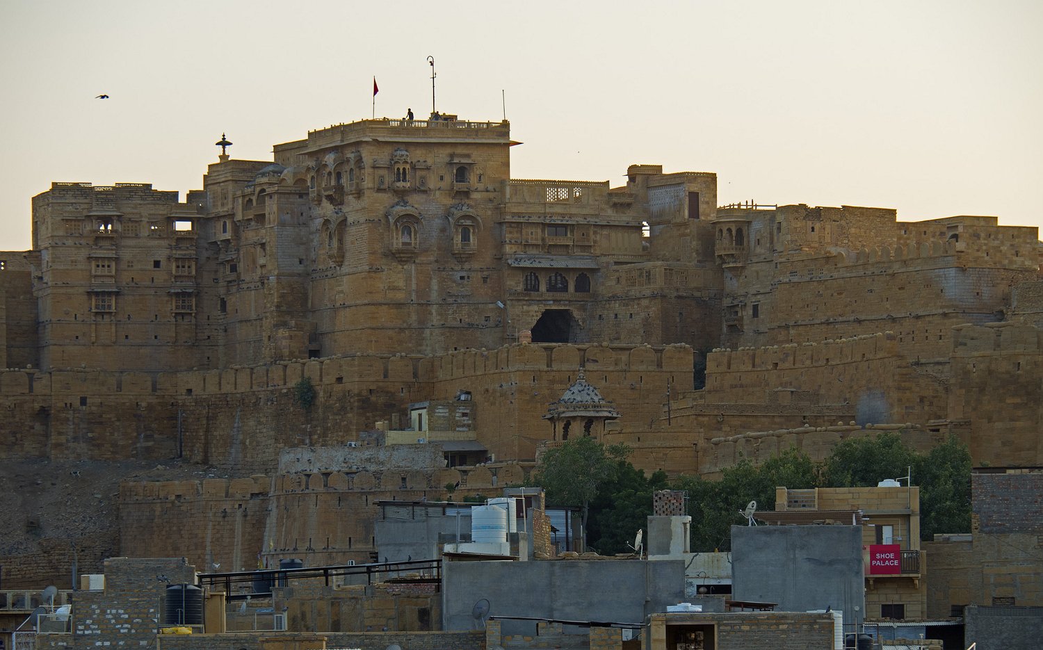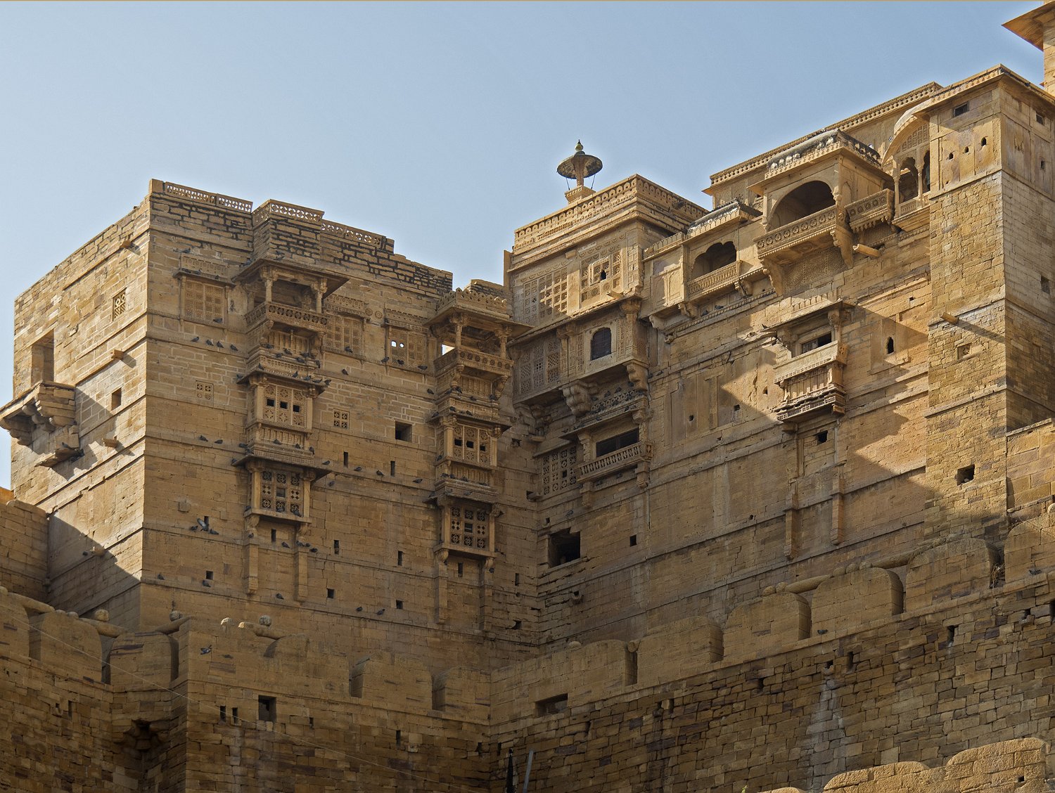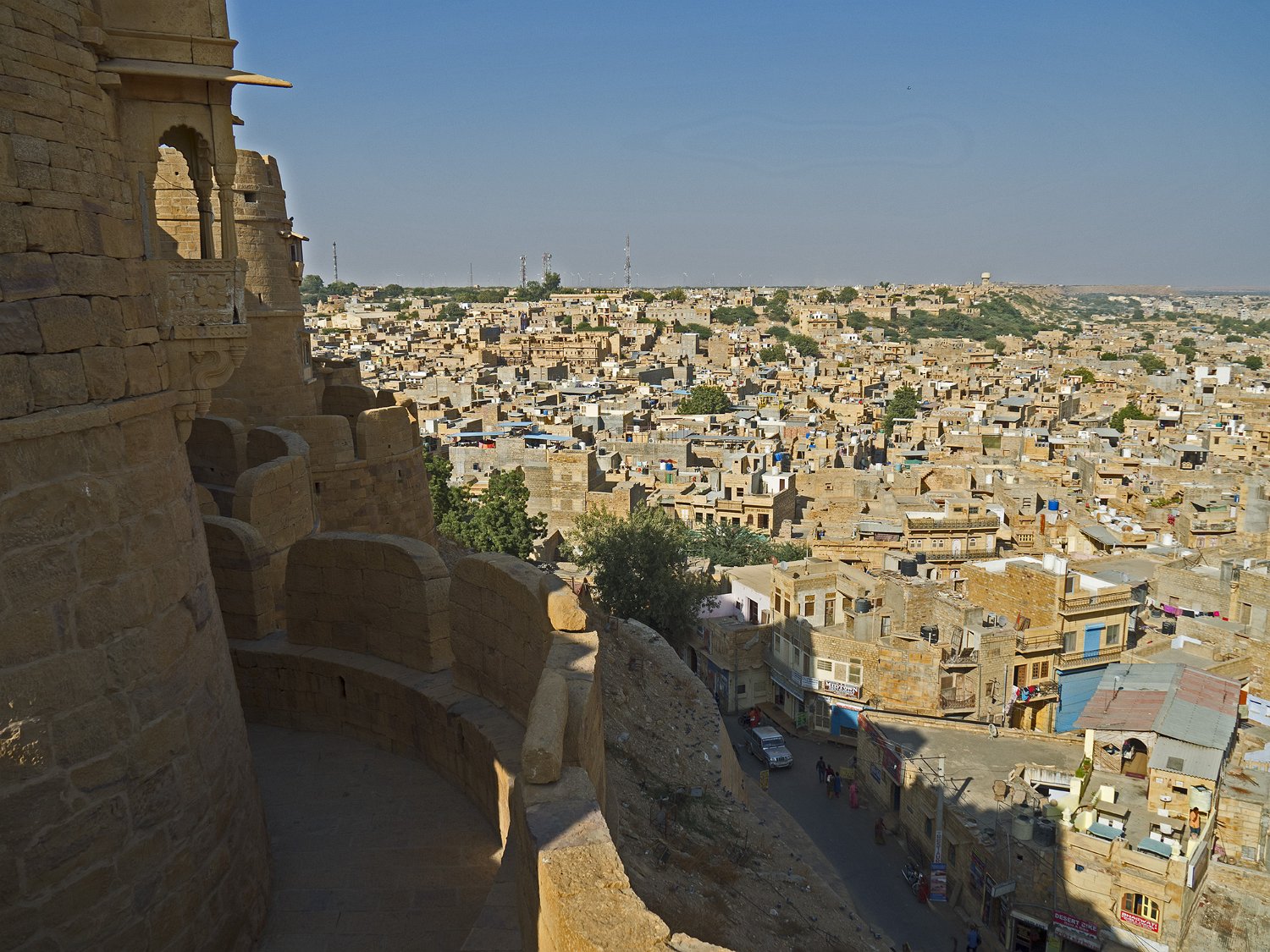 Vue panoramique sur la citadelle  La citadelle est construite sur une colline (Trikuta) de 80m de haut qui domine la ville de Jaisalmer La citadelle depuis Patwon Ki Haveli  La citadelle est encore habitée par près de 3000 personnes. Seules les deux castes les plus hautes peuvent résider dans la citadelle Entrée de la citadelle Rampe d'accès  La citadelle est défendue par 5 portes disposées en quinconce pour une meilleure défense