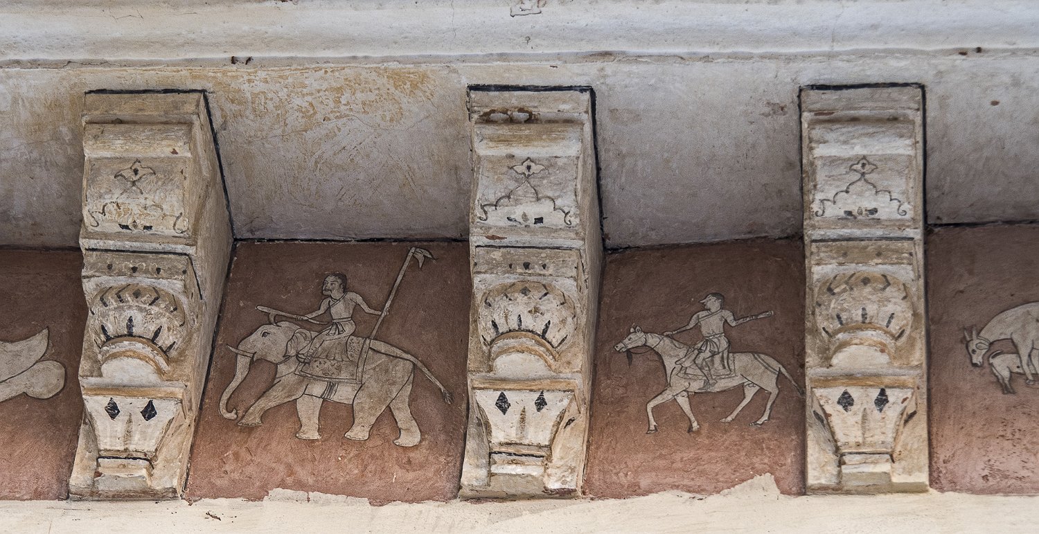 Le grand escalier d'accès à la cour supérieure Diwan-i-Aam (salle des audiences publiques) Plafond du Diwan-i-Aam Piliers du Diwan-i-Aam  La base des piliers est finement sculptée