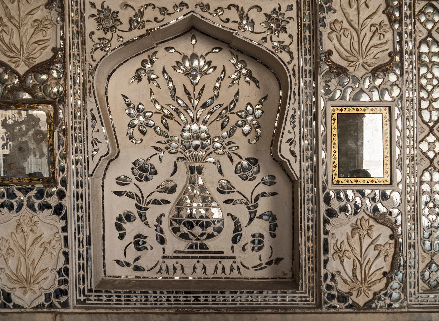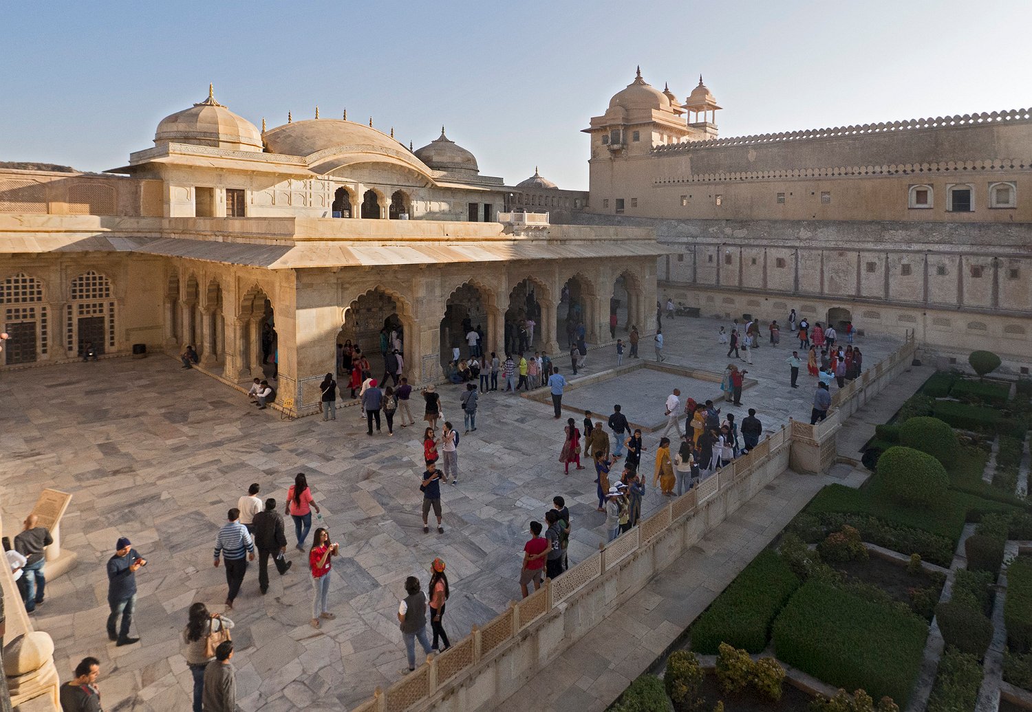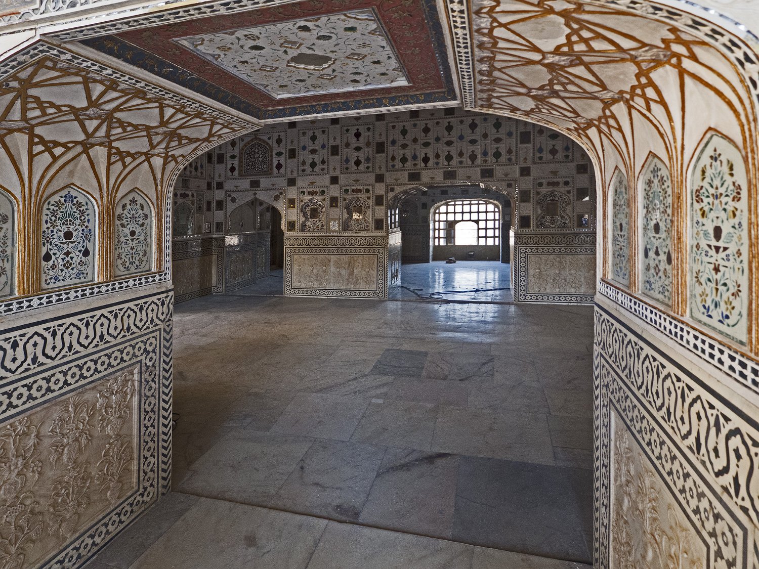 Jardin des femmes (Zenana Bagh) et bassin en étoile Sheesh Mahal (palais des miroirs) Galerie du Sheesh Mahal ou Jai Mandir (palais des miroirs)  Les murs sont recouverts de milliers de petits morceaux de verre et de motifs floraux Intérieur du Sheesh Mahal (palais des miroirs)  La pièce centrale servait de Diwan-i-Kaas (salle des audiences privées)