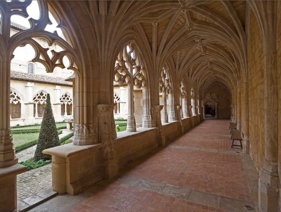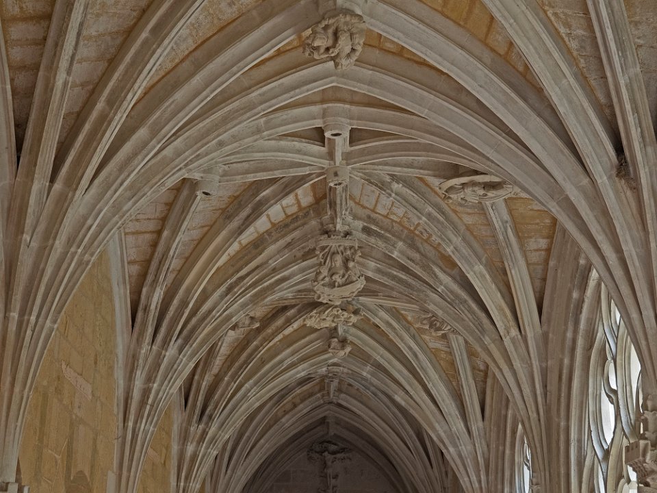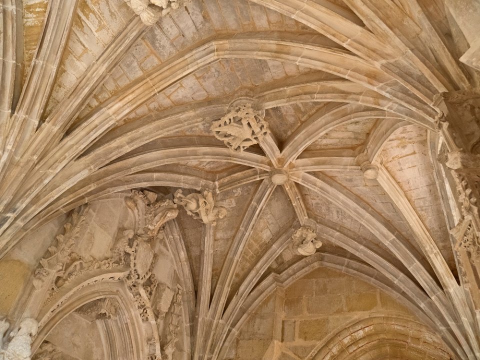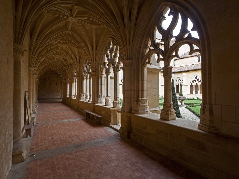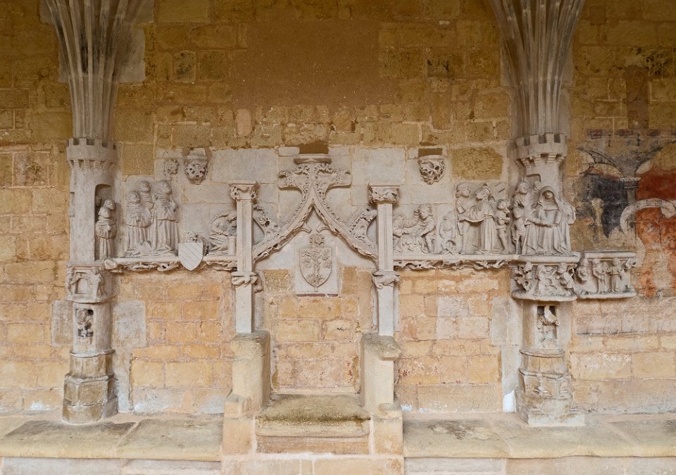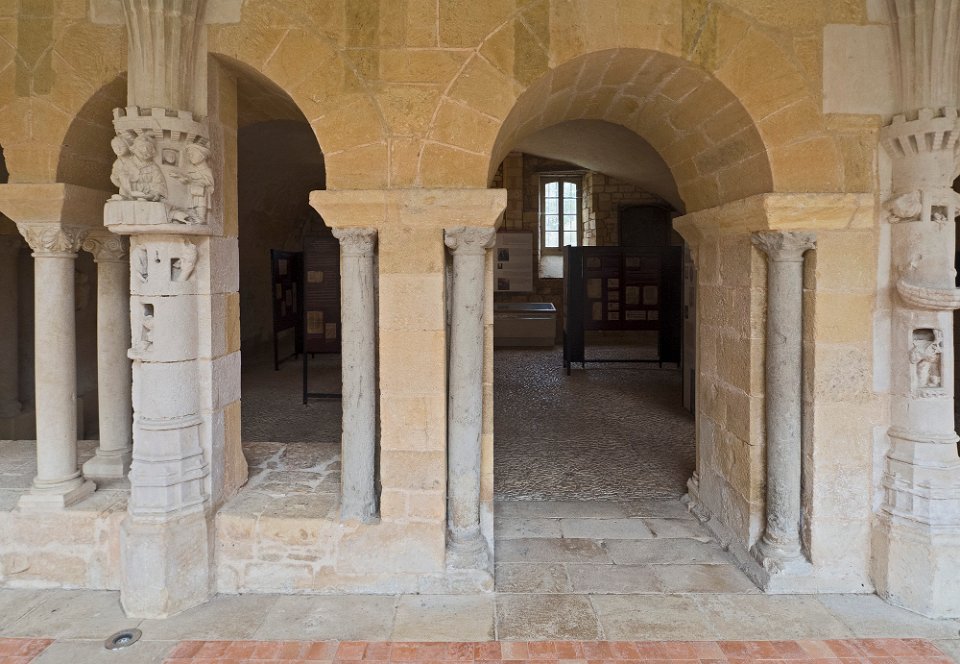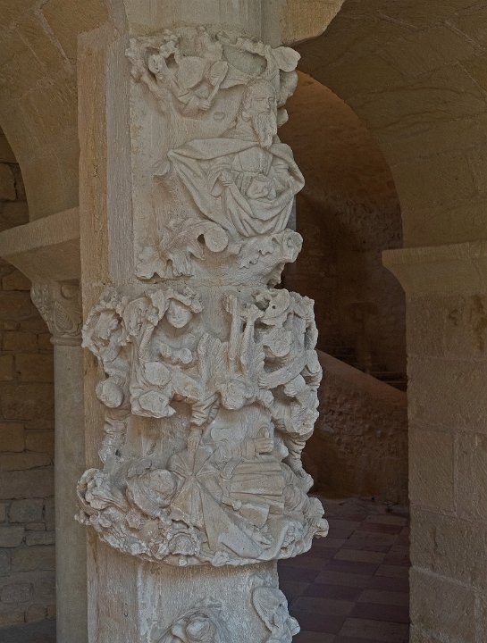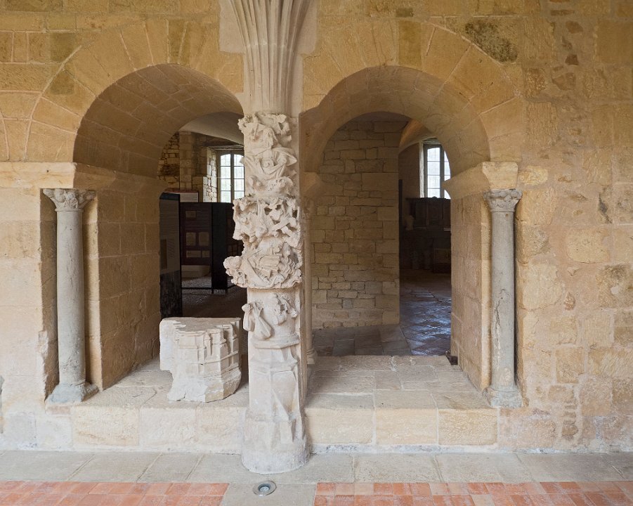 Sculpture sur pilier de la salle capitulaire (Lazare et le mauvais riche en haut, mort de Lazare en bas)