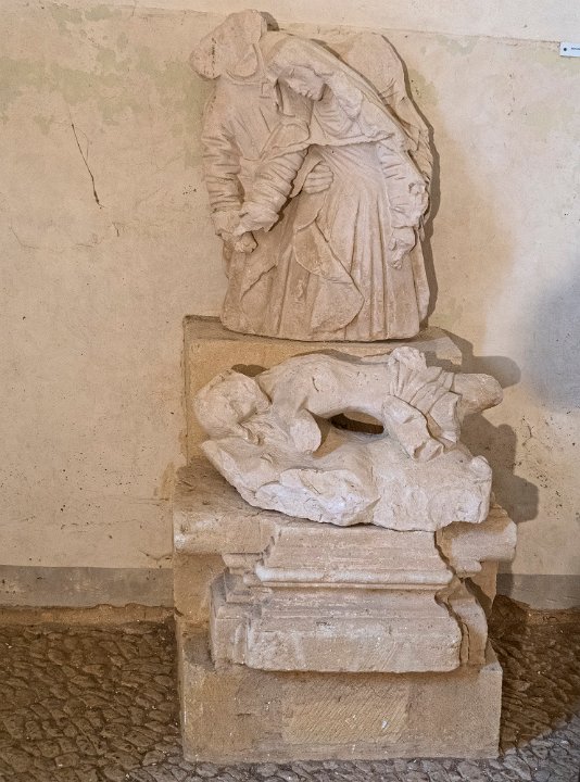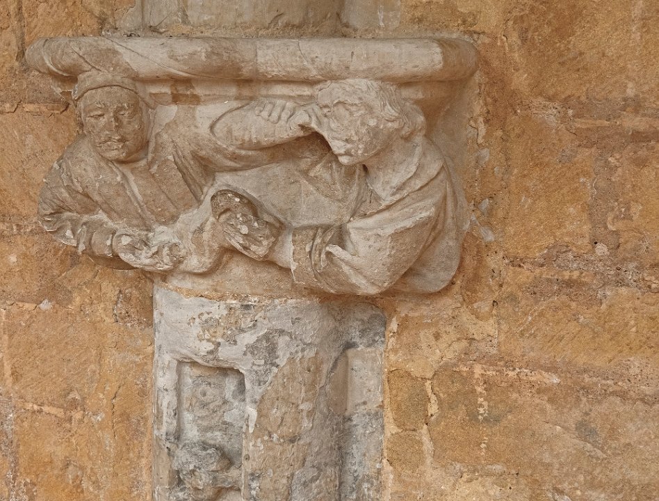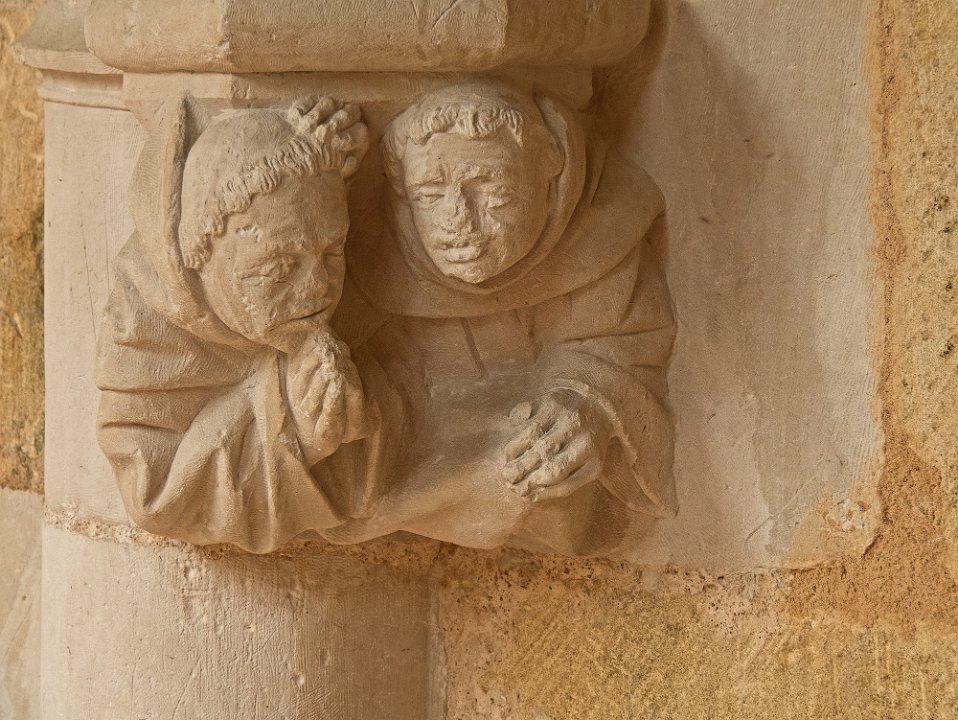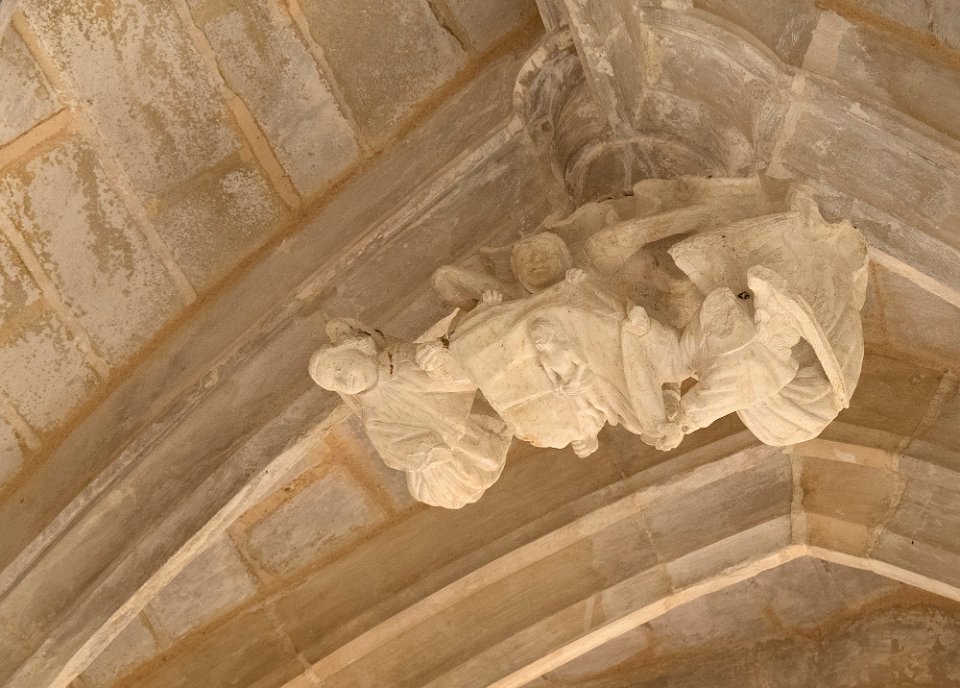 Sculpture sur pilier (deux personnage se disputant une volaille)