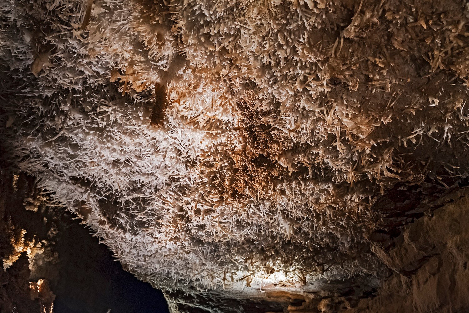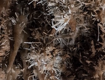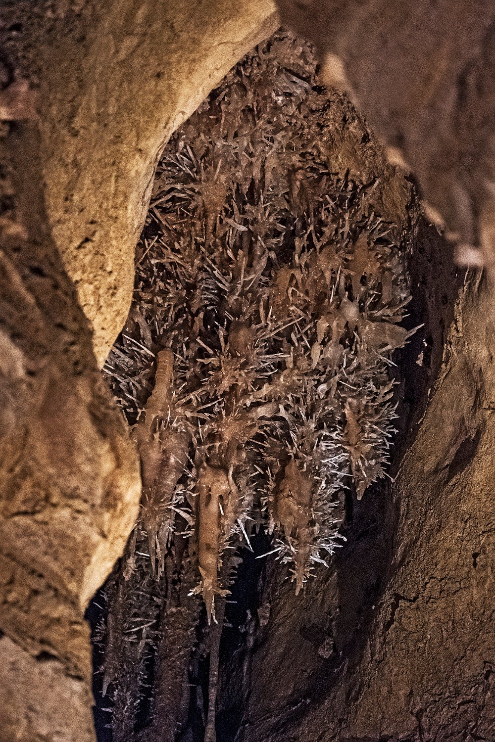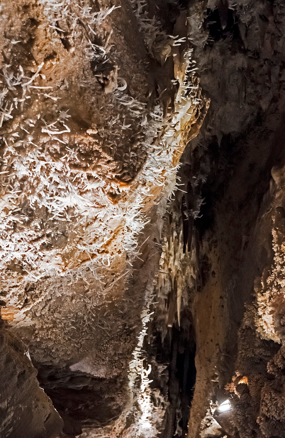 La grotte de Maxange est sitée au Buisson en Dordogne. Découverte en 2000 dans une carrière, elle a été ouverte au public en 2003 après des aménagements importants visant notamment à évacuer 3000m3 de sédiments encombrant les galeries. Les conditions géologiques particulières du site ont créé un univers tout à fait remarquable qui vaut à la grotte son appellation de «grotte des étoiles». Les parois et le plafond des galeries sont recouvertes de concrétions de type «exentriques" qui donne à la grotte son caractère unique. Remarque : le flash étant interdit, ces photos ont été prises avec un fuji XT4 entre 8000 et 12800 ISO avec le seul éclairage des galeries. La qualité des images est donc altétée par un bruit de luminance assez présent malgré le traitement appliqué et une faible dynamique.
