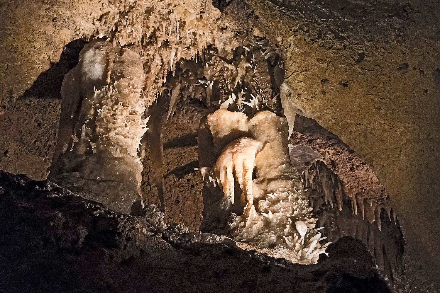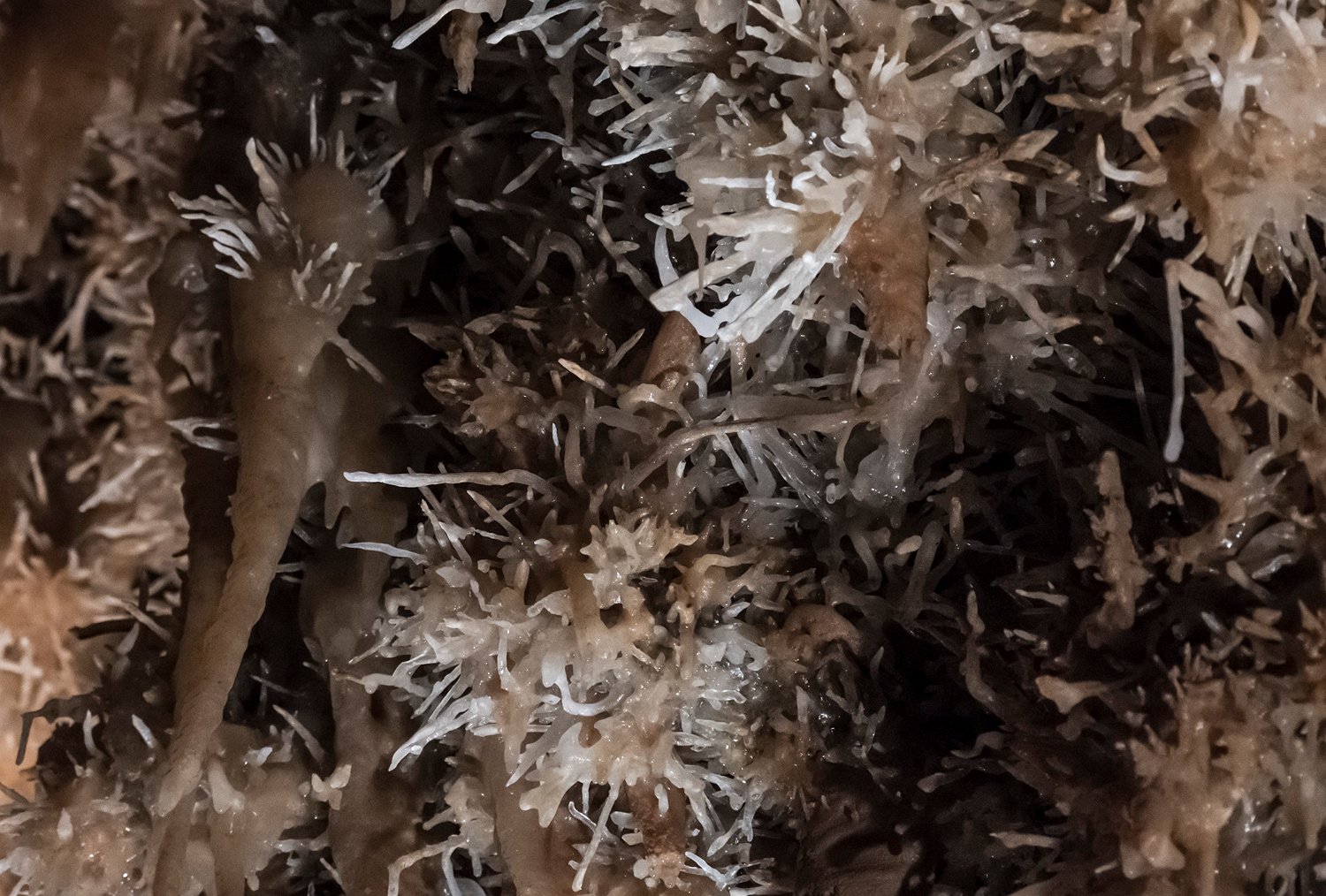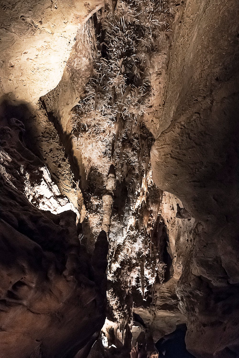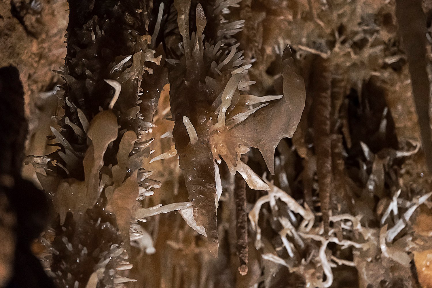 La grotte de Maxange est sitée au Buisson en Dordogne. Découverte en 2000 dans une carrière, elle a été ouverte au public en 2003 après des aménagements importants visant notamment à évacuer 3000m3 de sédiments encombrant les galeries. Les conditions géologiques particulières du site ont créé un univers tout à fait remarquable qui vaut à la grotte son appellation de «grotte des étoiles». Les parois et le plafond des galeries sont recouvertes de concrétions de type «exentriques" qui donne à la grotte son caractère unique. Remarque : le flash étant interdit, ces photos ont été prises avec un fuji XT4 entre 8000 et 12800 ISO avec le seul éclairage des galeries. La qualité des images est donc altétée par un bruit de luminance assez présent malgré le traitement appliqué et une faible dynamique.
