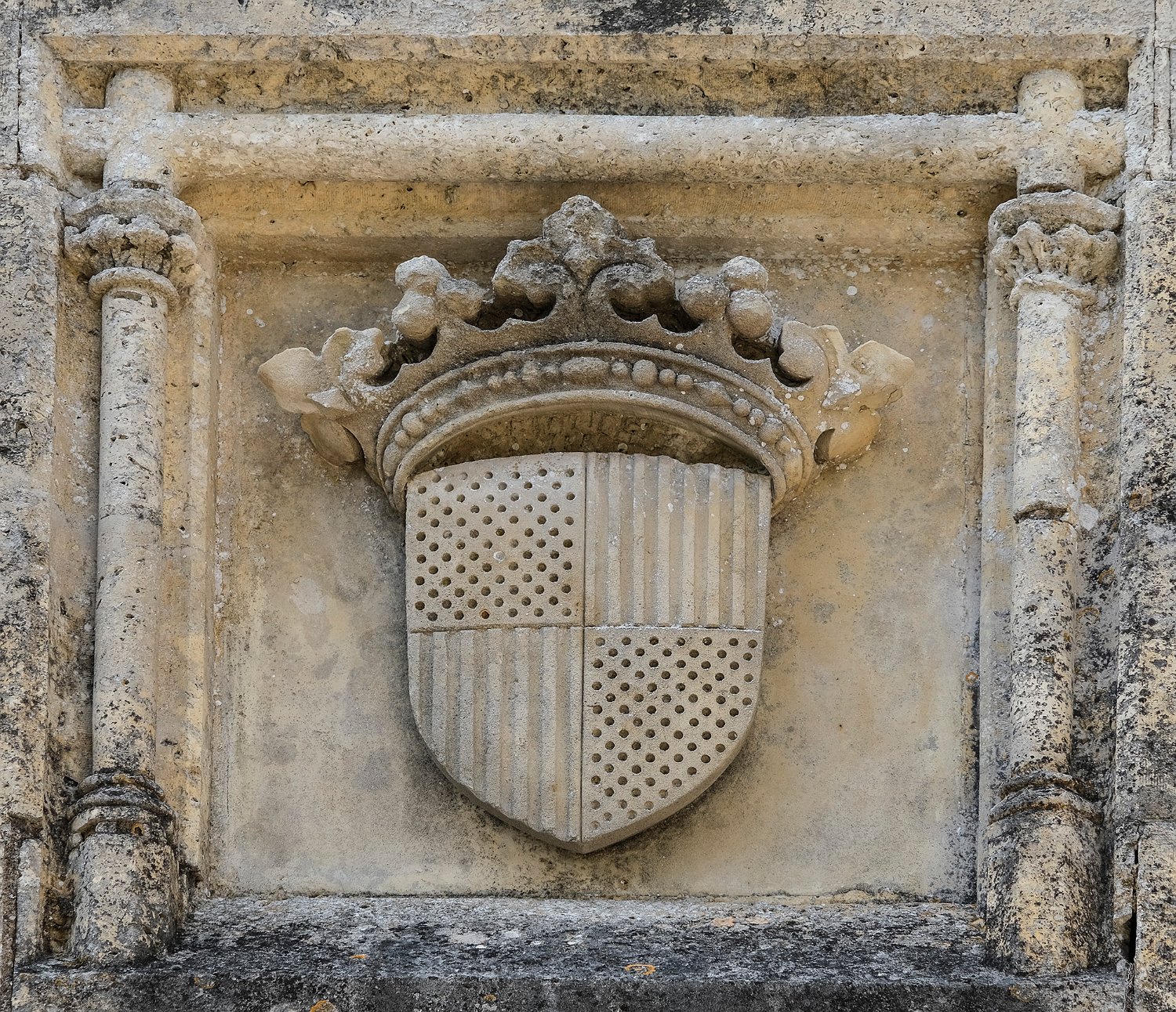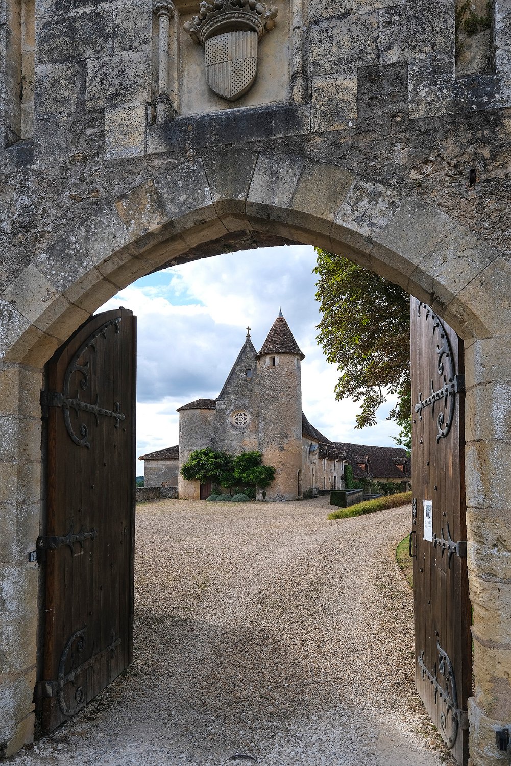 Vue d'ensemble depuis l'entrée : à gauche la chapelle, à droite le château de part et d'autre d'une grande tour
