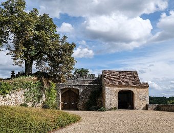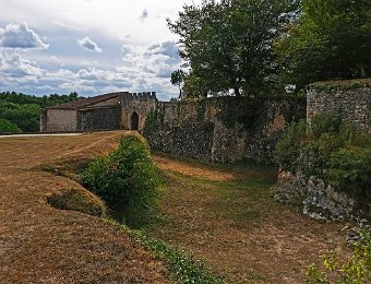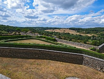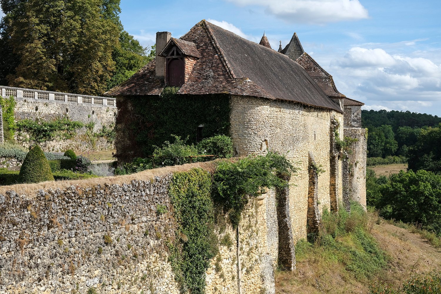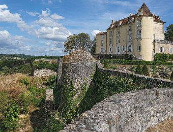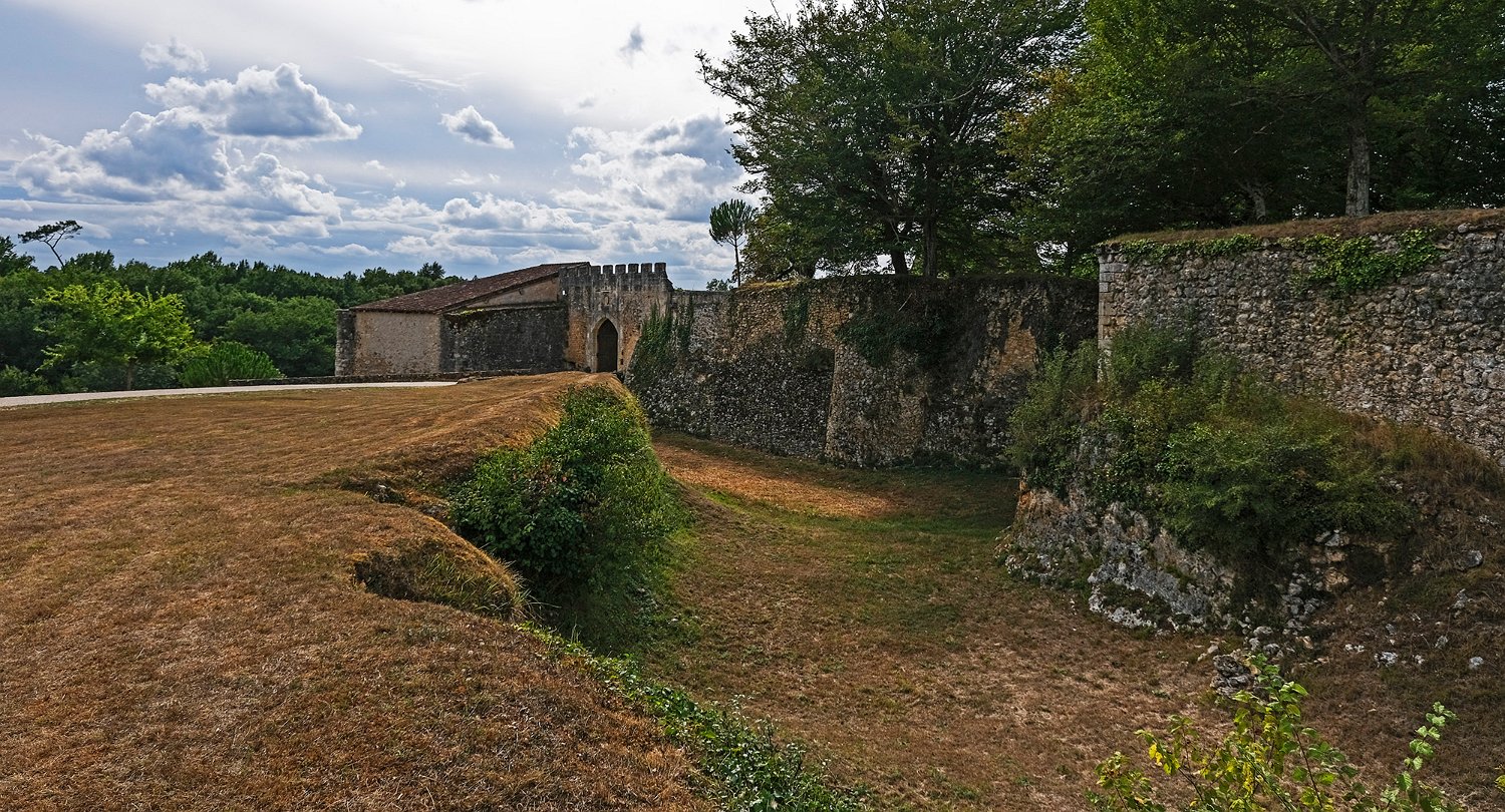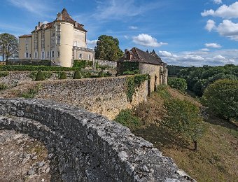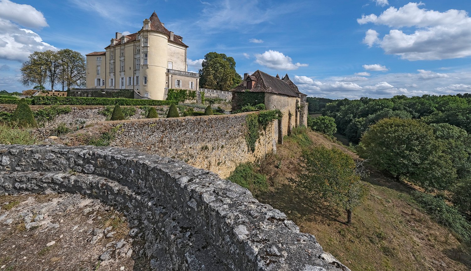 Vue du château et de ses remparts extérieurs côté nord (vers vallée de la Crempse)