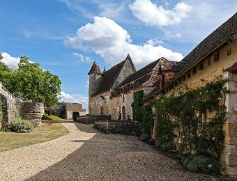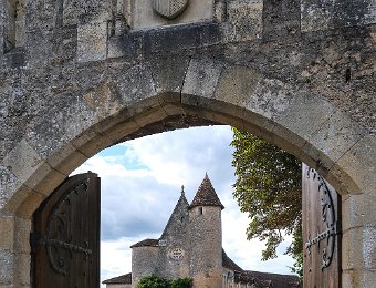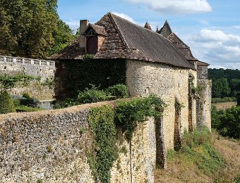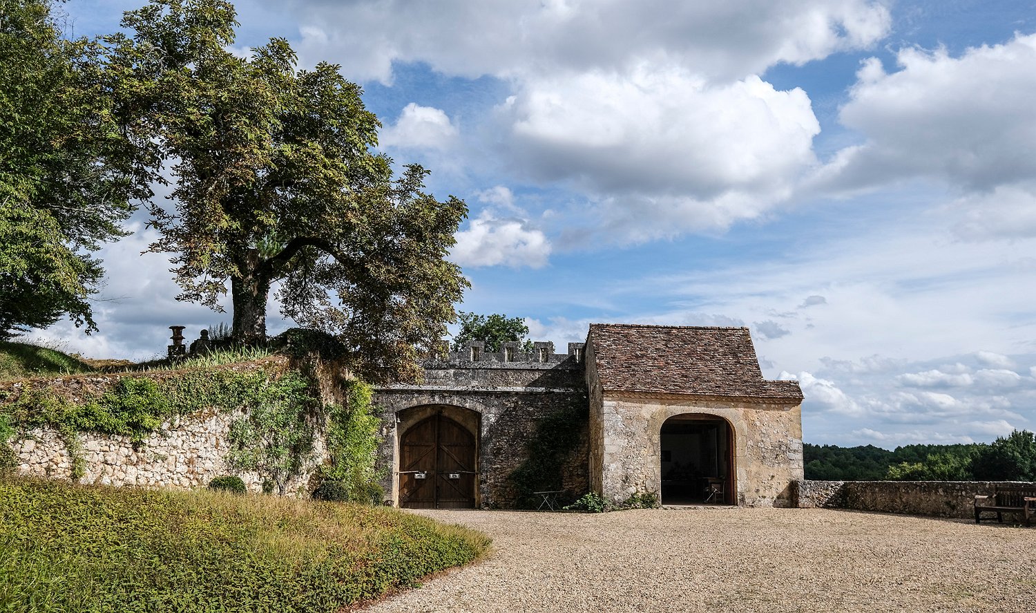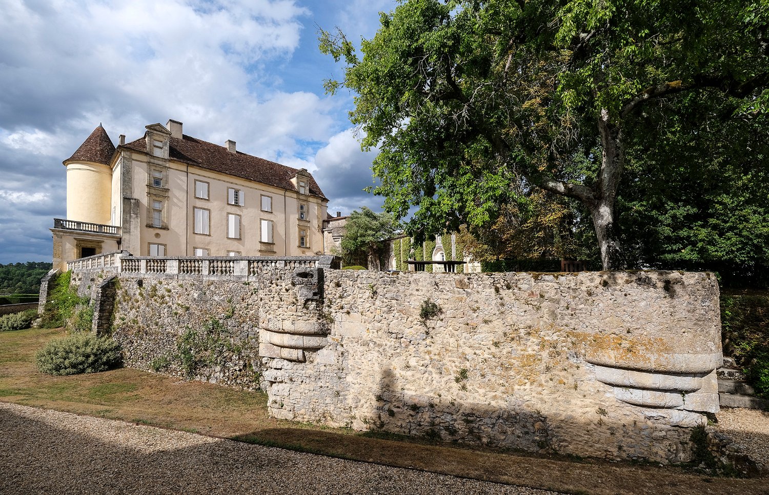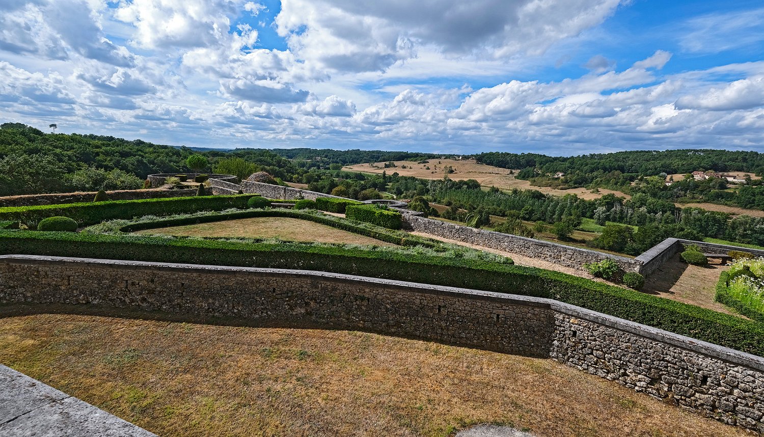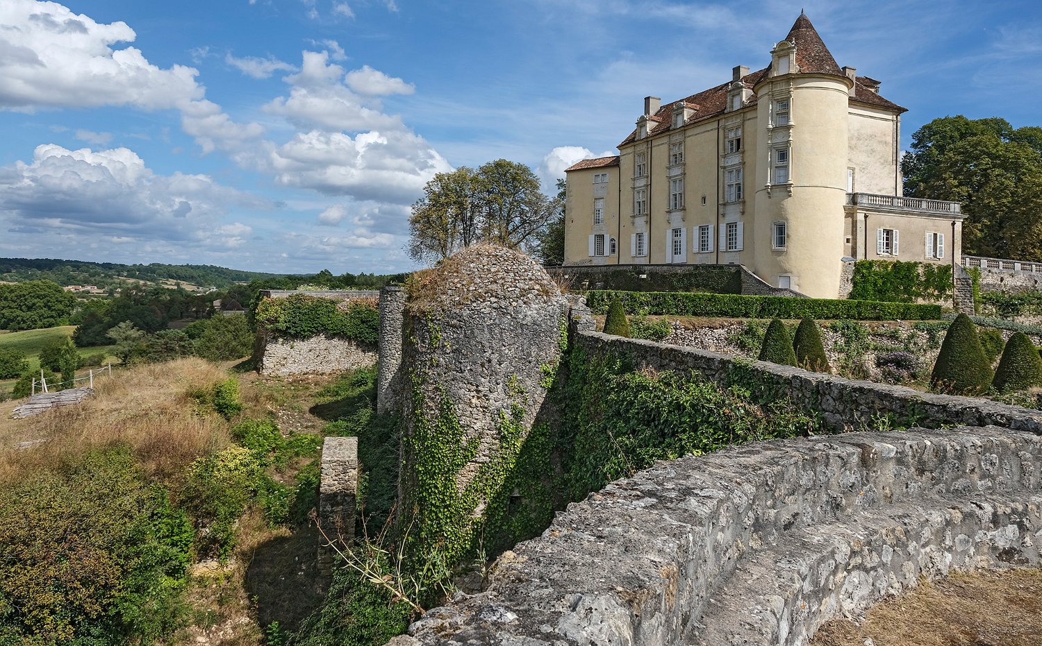Vue du château et de ses remparts extérieurs côté nord (vers vallée de la Crempse)