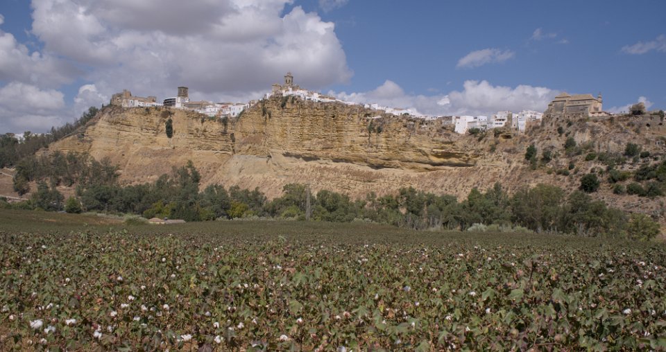 Arcos avec un champs de coton  Arcos de la Frontera se situe sur une colline surplombant une gorge de la rivière Guadalete. Fleur de coton Vue sur la ville Vue sur le château Vue sur l'église San Pedro