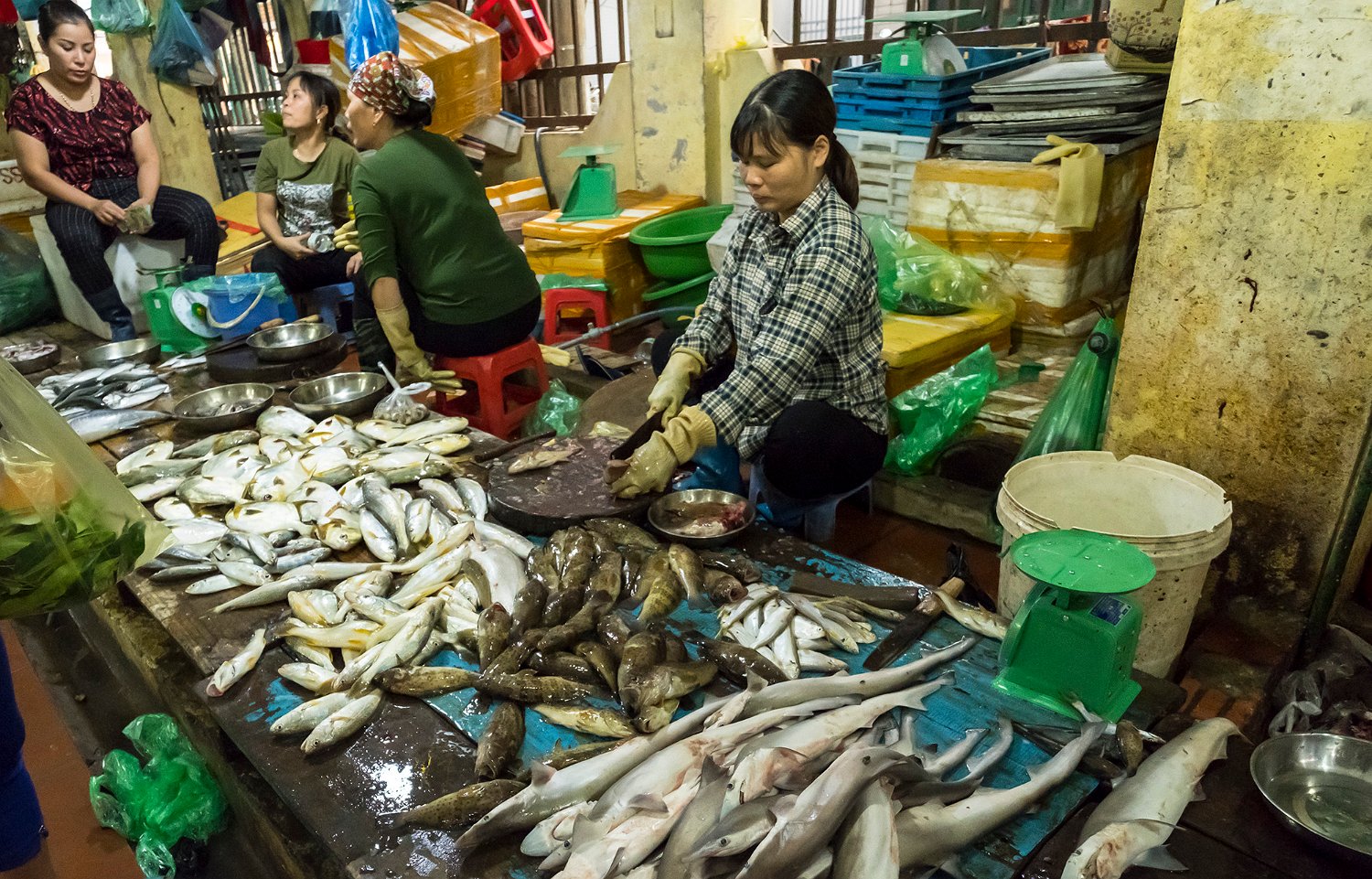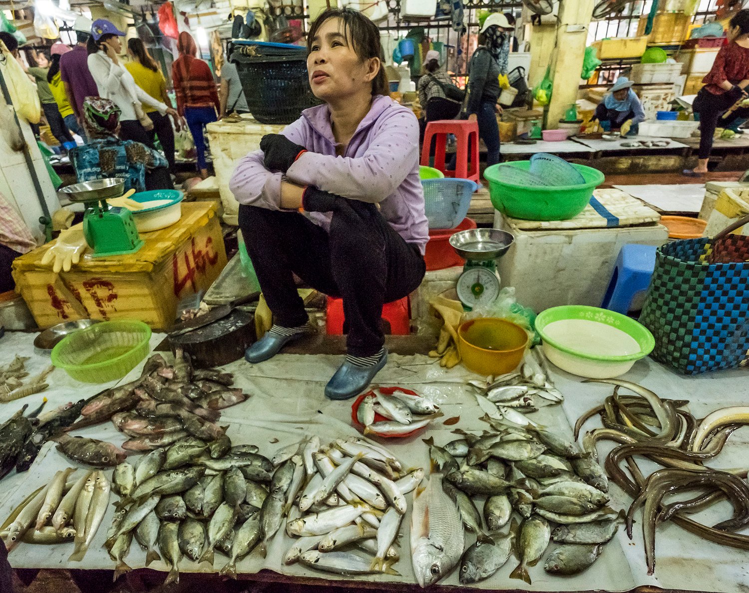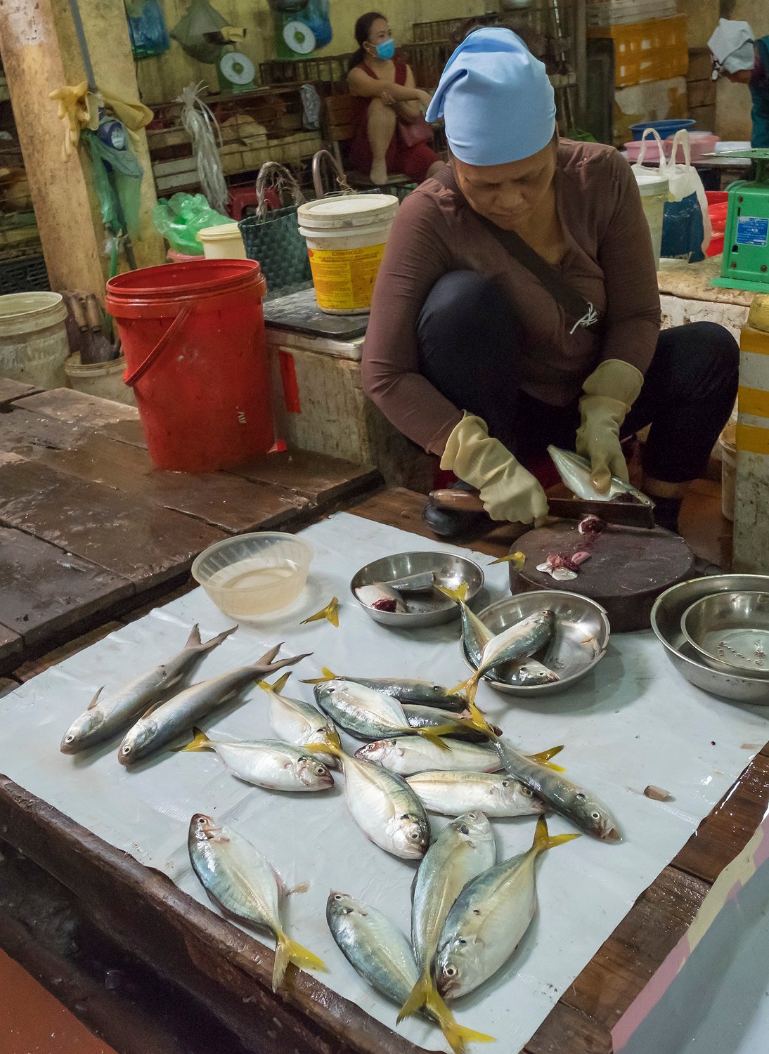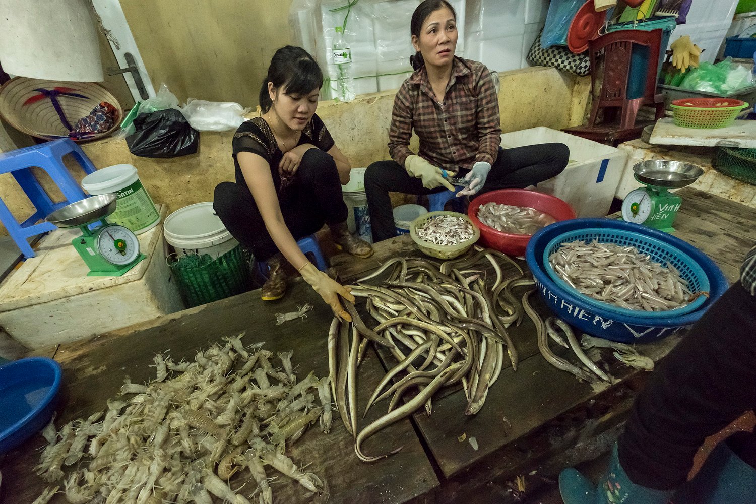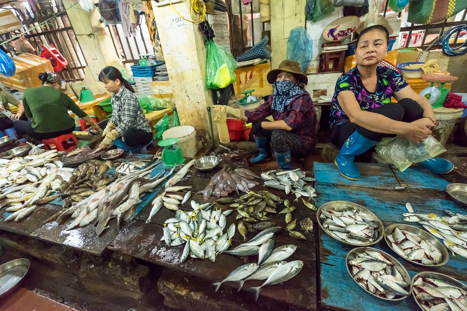 33Produits de la mer au marché de Cat Ba ( crevettes mantes à gauche, poissons)