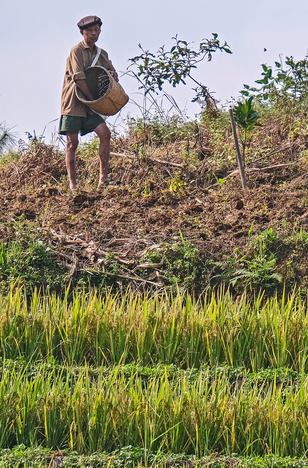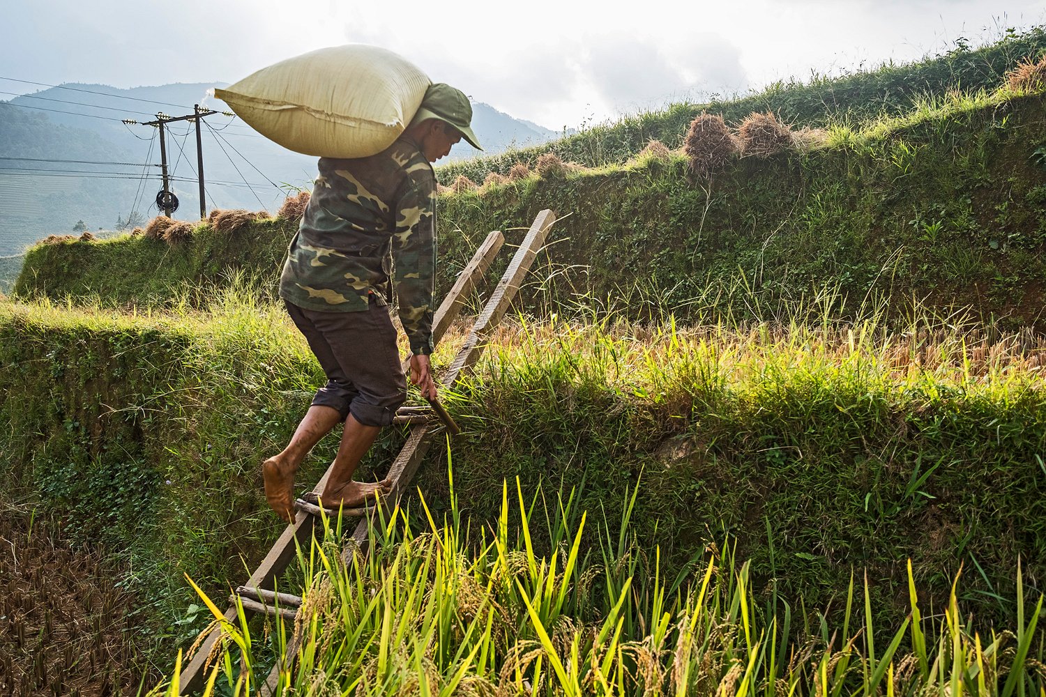 Paysan remontant un sac de riz