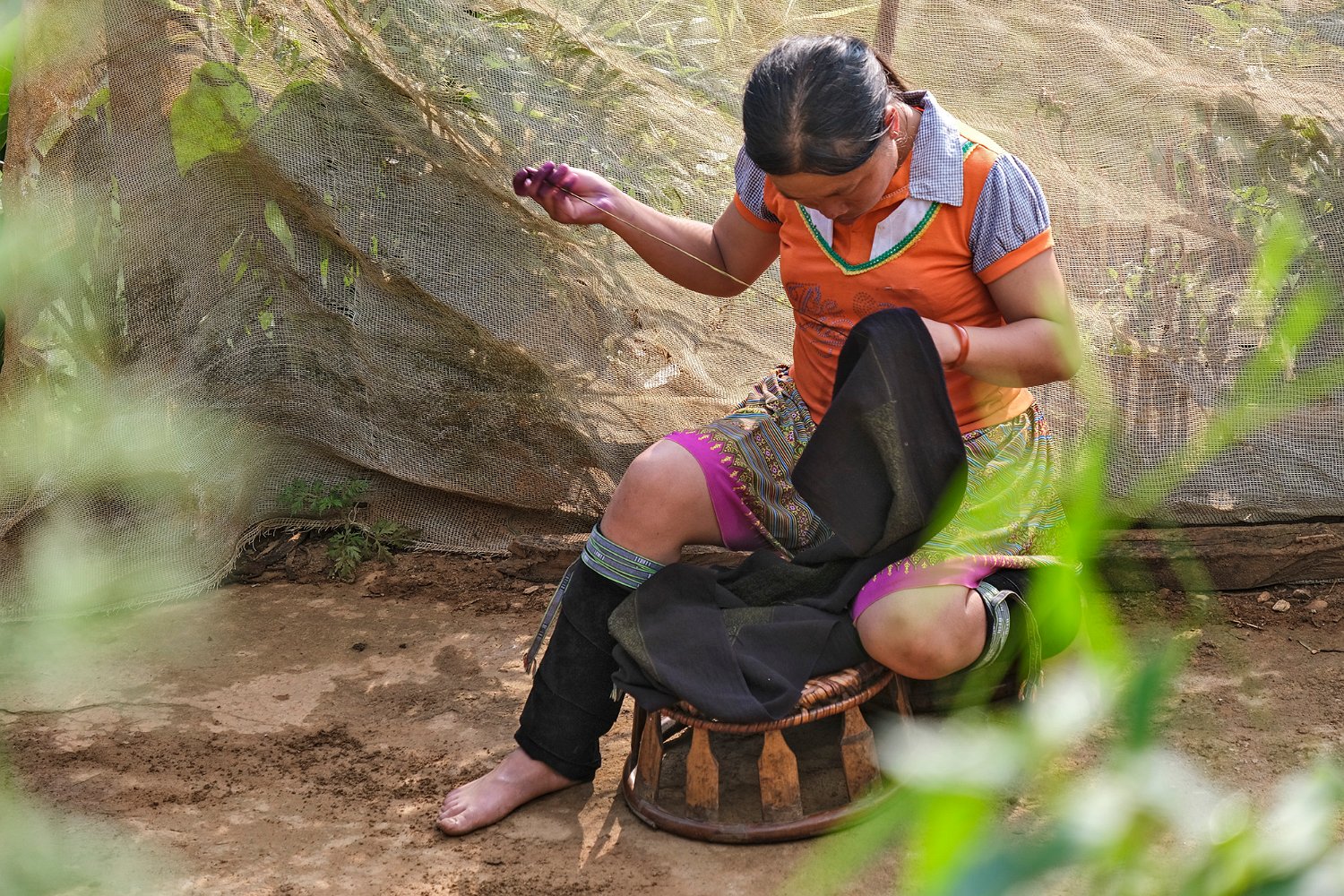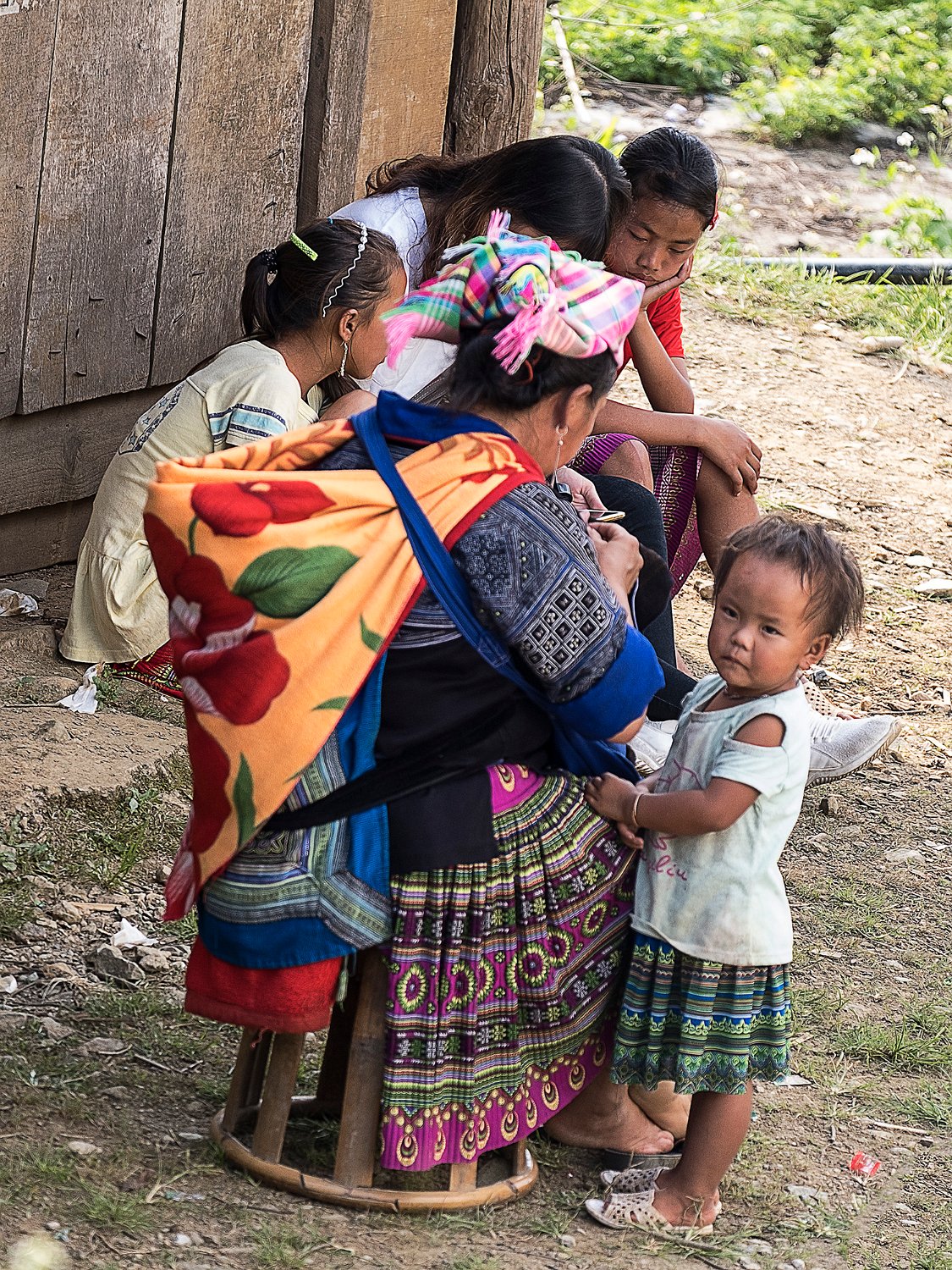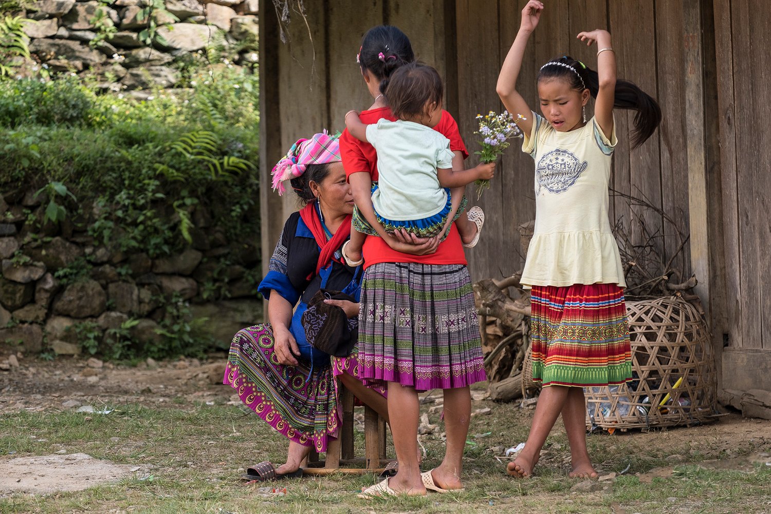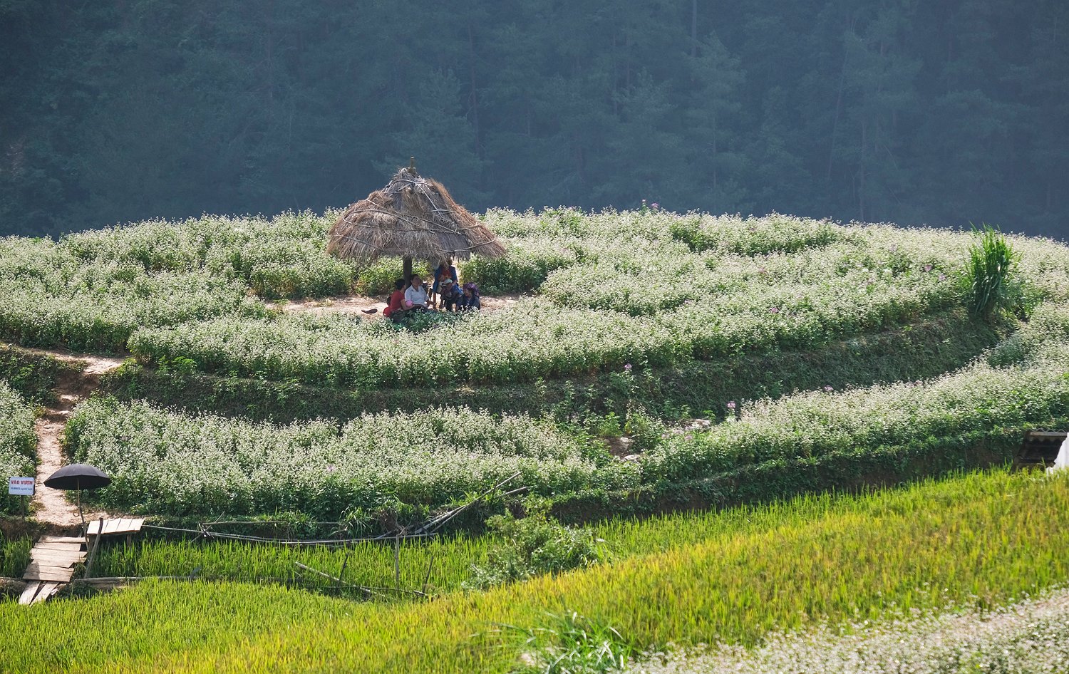 Famille H'mong au repos à l'ombre au sommet de terrasse (au milieu de plantes médicinales ou alimentaires ?)